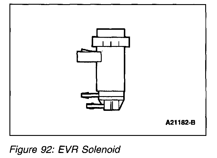 The EGR vacuum regulator solenoid (EVR), (Figure 92) is an electromagnetic device which is used to regulate the vacuum supply to the EGR valve. The solenoid contains a coil which magnetically controls the position of a disc to regulate the vacuum. As the duty cycle to the coil increases, the vacuum signal passed through the solenoid to the EGR valve also increases. Vacuum not directed to the EGR valve is vented through the solenoid vent to atmosphere. Note that at 0% duty cycle (no electrical signal applied), the EGR vacuum regulator solenoid allows some vacuum to pass, but not enough to open the EGR valve.