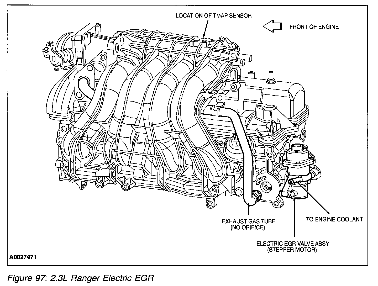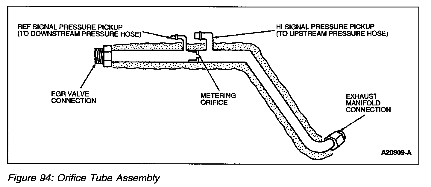 The orifice tube assembly (Figure 94) is a section of tubing connecting the exhaust system to the intake manifold. The assembly provides the flow path for the EGR to the intake manifold and also contains the metering orifice and two pressure pick-up tubes. The internal metering orifice creates a measurable pressure drop across it as the EGR valve opens and closes. This pressure differential across the orifice is picked up by the differential pressure feedback EGR sensor which provides feedback to the PCM.