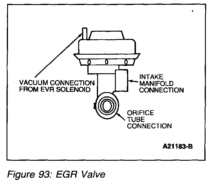 The EGR valve (Figure 93) in the Differential Pressure Feedback EGR system is a conventional, vacuum-actuated EGR valve. The valve increases or decreases the flow of exhaust gas recirculation. As vacuum applied to the EGR valve diaphragm overcomes the spring force, the valve begins to open. As the vacuum signal weakens, at 5.4 kPa (1.6 in-Hg) or less, the spring force closes the valve. The EGR valve is fully open at about 15 kPa (4.5 in-Hg).