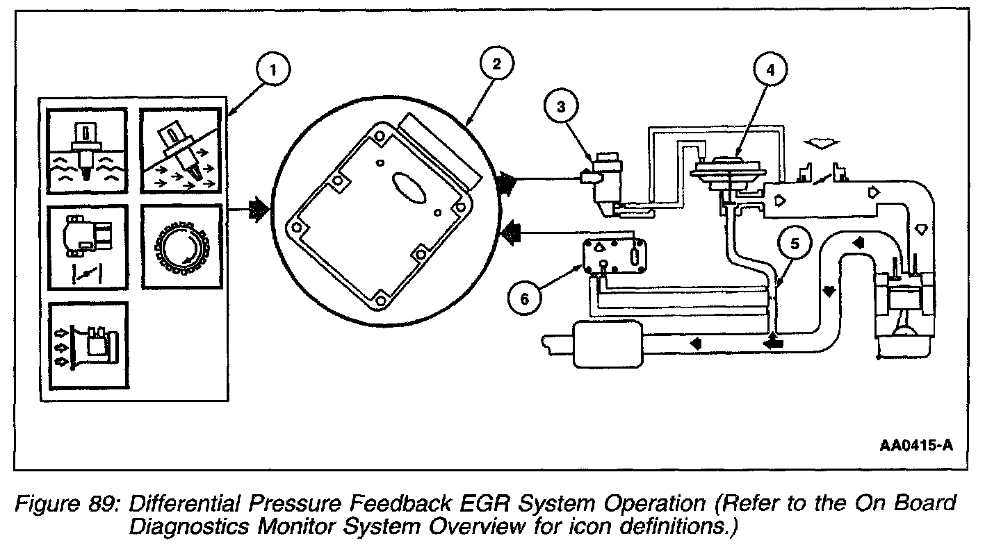 The Differential Pressure Feedback EGR system consists of a differential pressure feedback EGR sensor, EGR vacuum regulator solenoid, EGR valve, orifice tube assembly, powertrain control module (PCM) and connecting wires and vacuum hoses. Operation of the system is as follows (Figure 89):