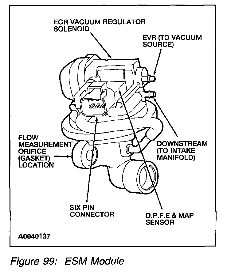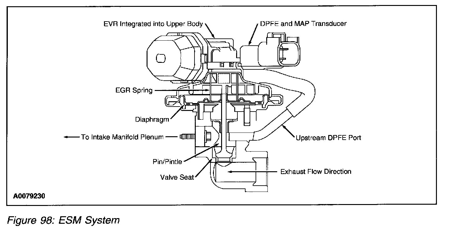 The ESM EGR system is an updated DPFE EGR system. It functions in the same manner as the conventional DPFE system, however the various system components have been integrated into a single component called the EGR System Module (ESM) (Figure 98). The flange of the valve portion of the ESM bolts directly to the intake manifold with a metal gasket that forms the measuring orifice. This arrangement increases system reliability, response time and system precision. By relocating the EGR orifice from the exhaust to the intake side of the EGR valve, the downstream pressure signal measures Manifold Absolute Pressure (MAP). The system provides the PCM with a differential DPFE signal, identical to a traditional DPFE system.