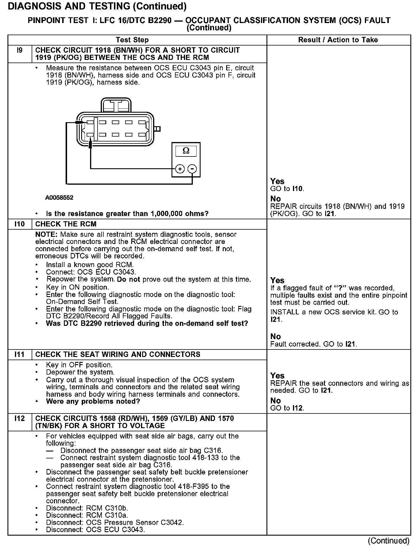 PINPOINT TEST I: LFC 16/DTC B2290 - OCCUPANT CLASSIFICATION SYSTEM (OCS) FAULTTest I1-I2: