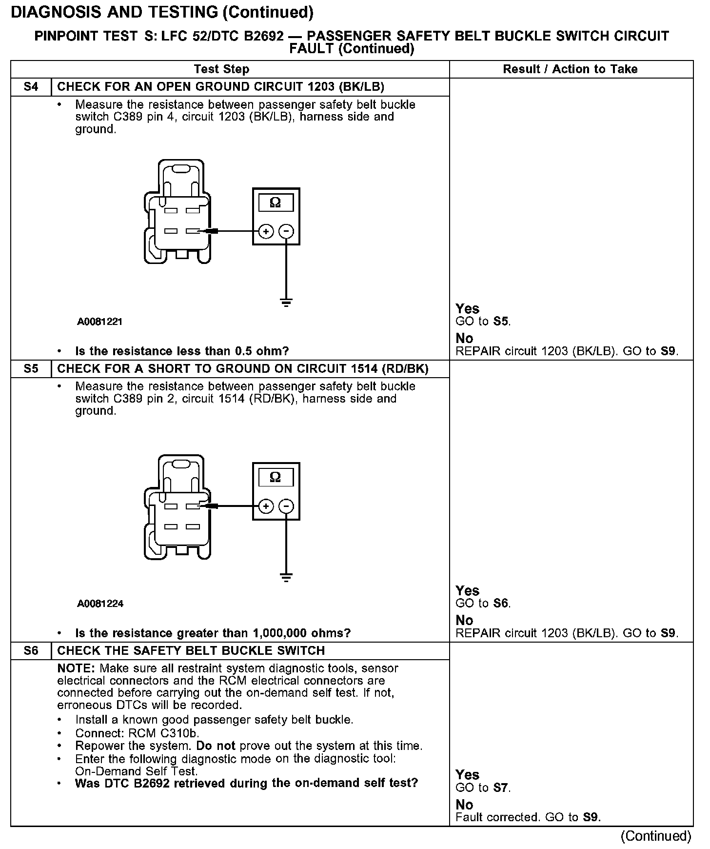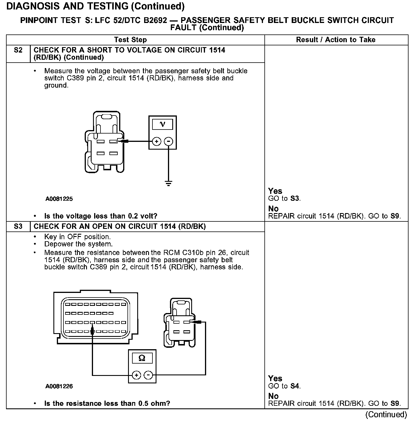 PINPOINT TEST S: LFC 52/DTC B2692 - PASSENGER SAFETY BELT BUCKLE SWITCH CIRCUIT FAULTTest S1-S2: