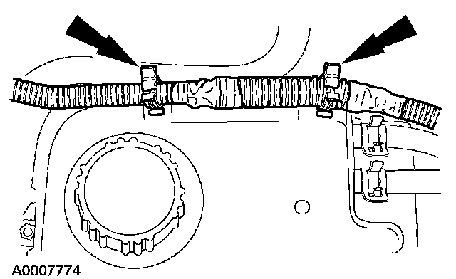 4. Loosen the clamps and disconnect the hoses. Drain the fluid into a suitable container.