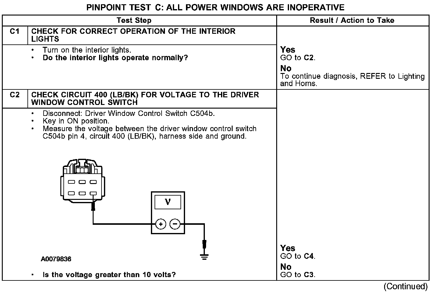 PINPOINT TEST C: ALL POWER WINDOWS ARE INOPERATIVE
