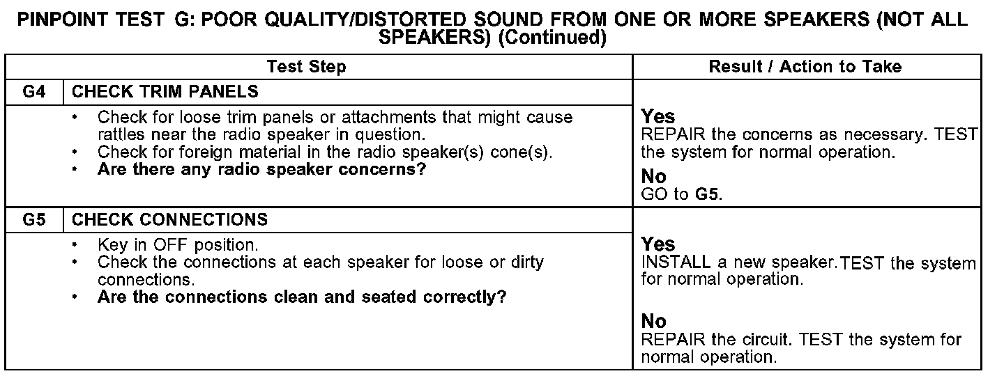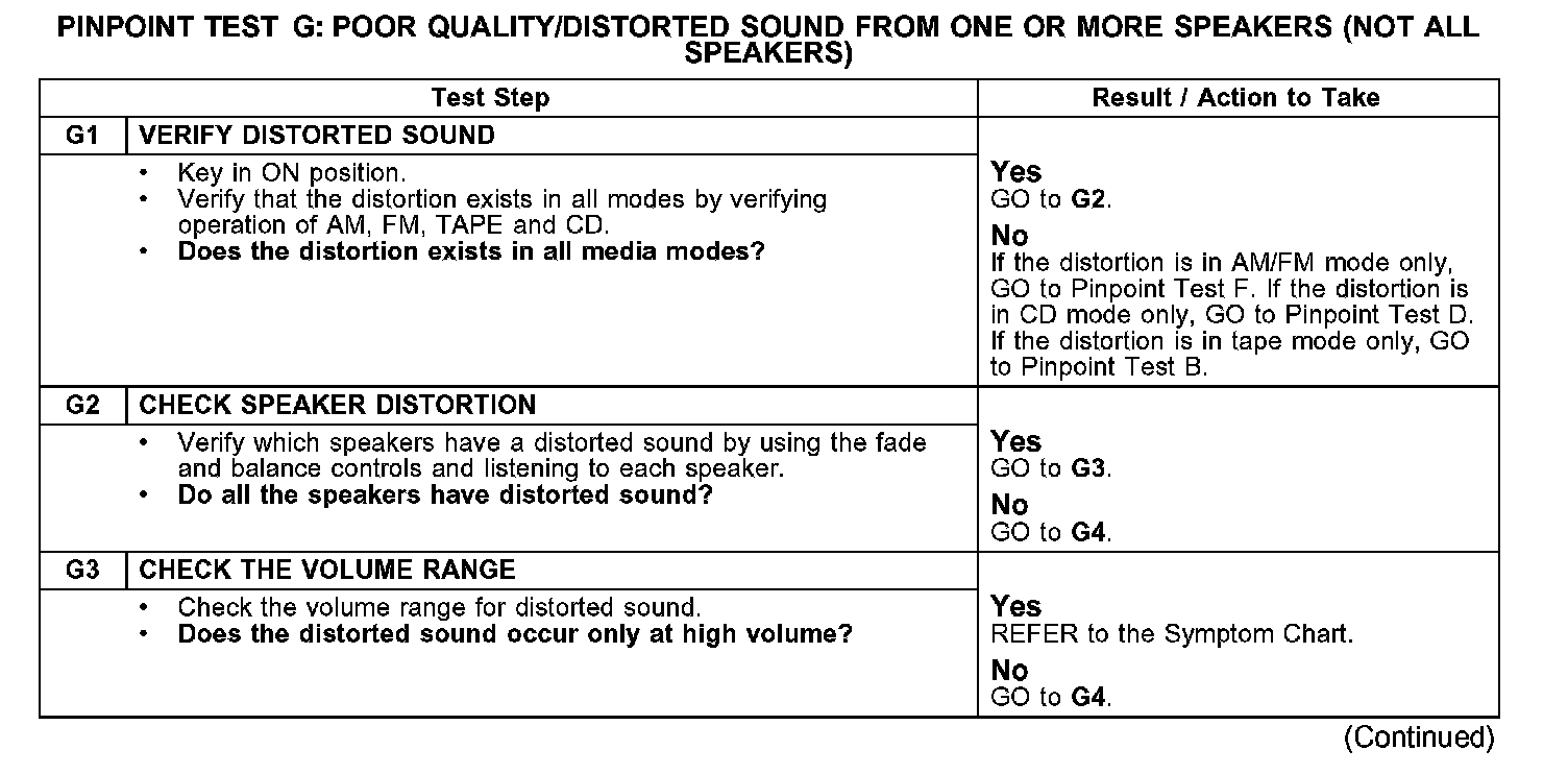 PINPOINT TEST G: POOR QUALITY/DISTORTED SOUND FROM ONE OR MORE SPEAKERS (NOT ALL SPEAKERS)
