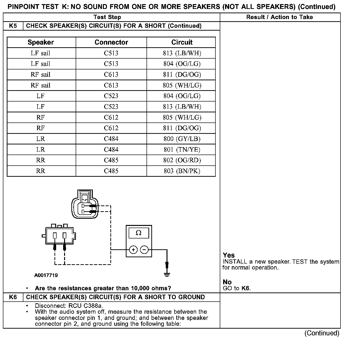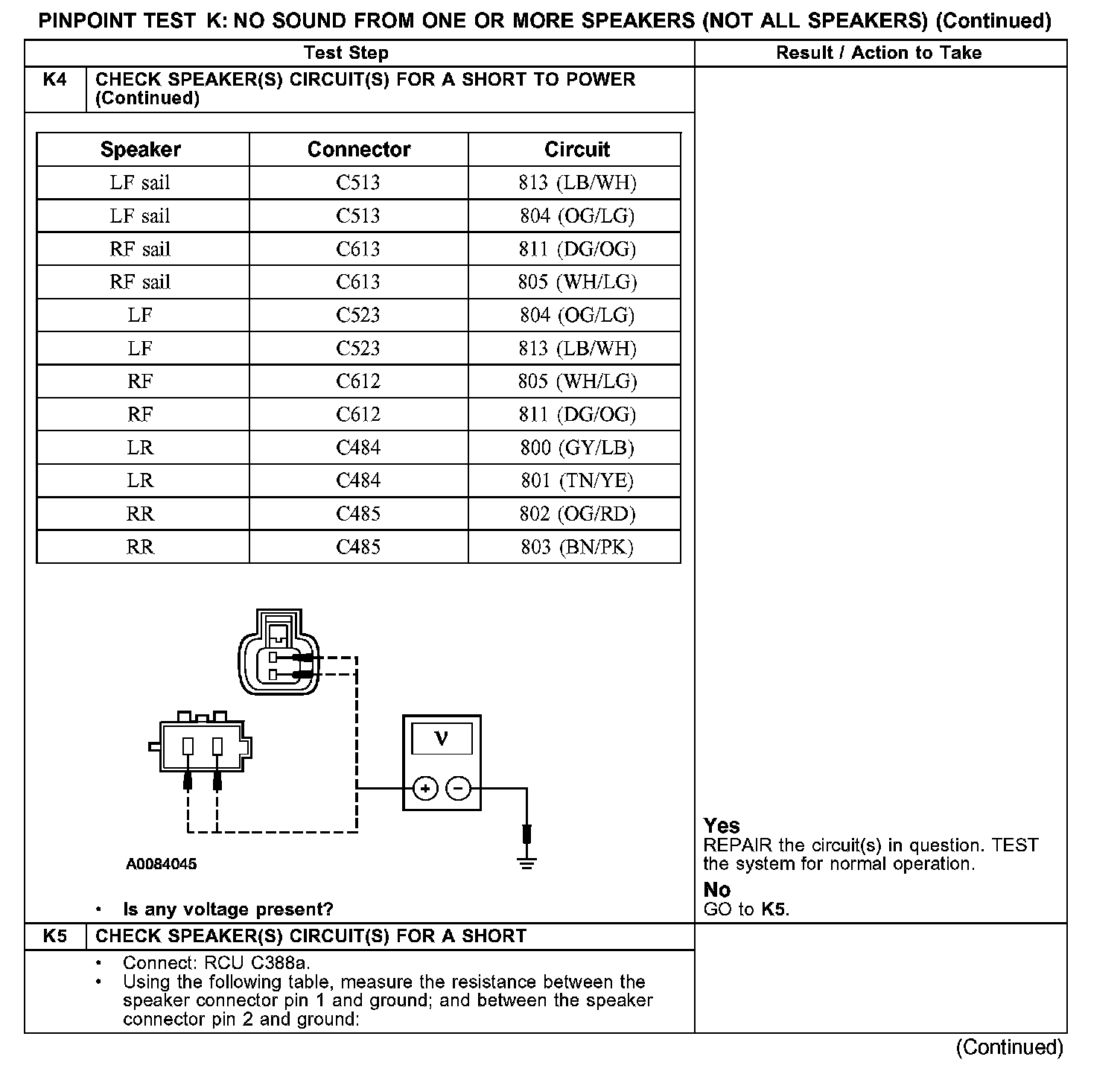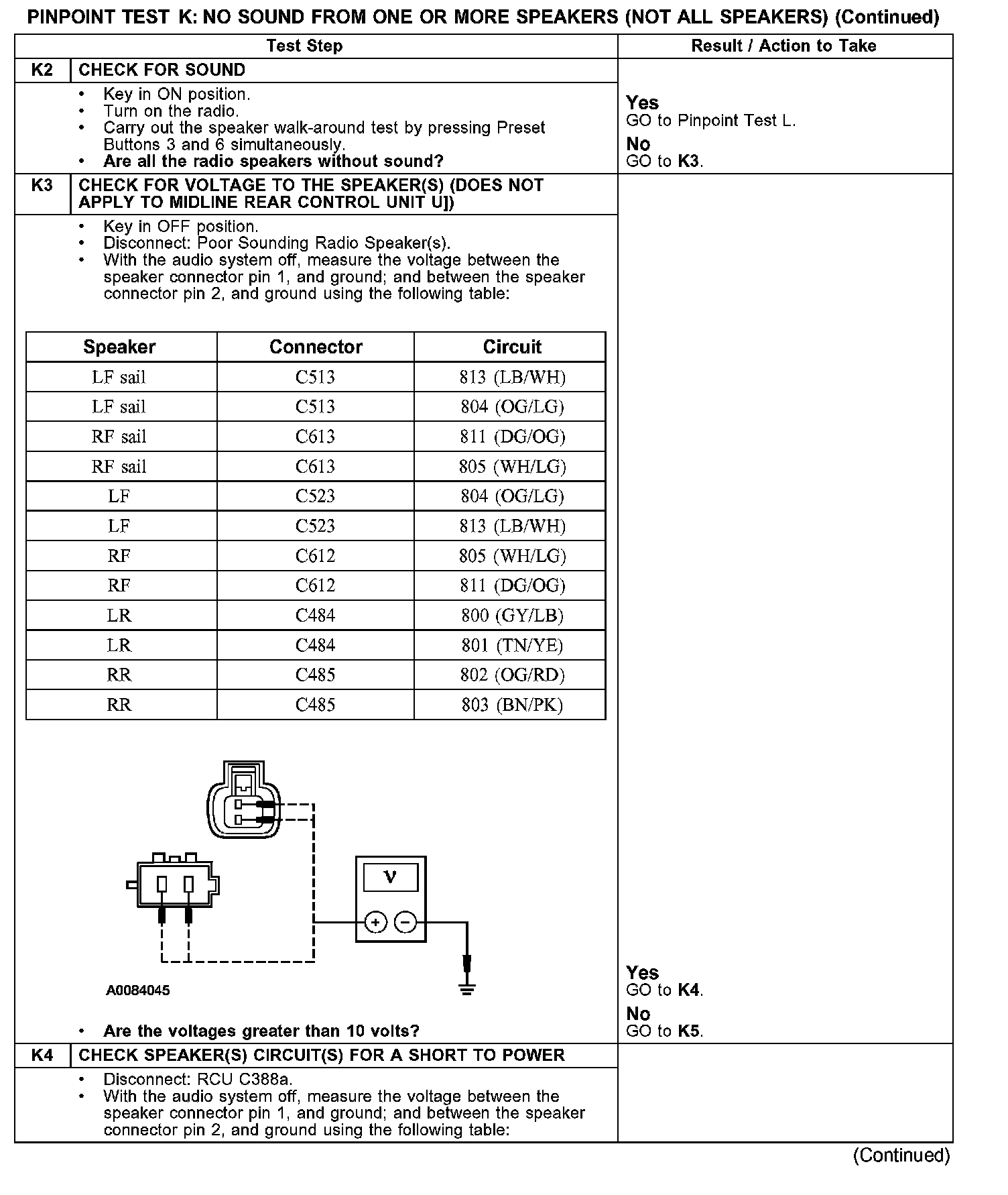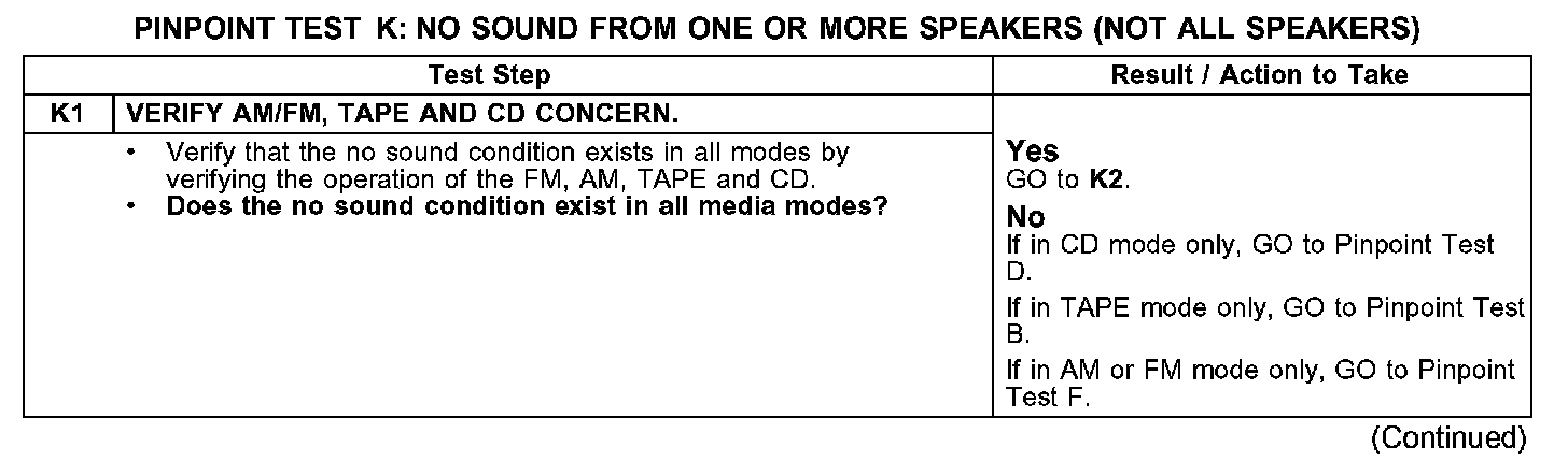 PINPOINT TEST K: NO SOUND FROM ONE OR MORE SPEAKERS (NOT ALL SPEAKERS)