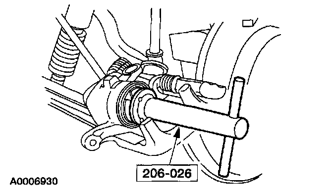 ^ Unload the spring tension from the parking brake lever pin retainer clip and spring cover using the special tool, a 6-mm washer head nut and a 1/2-inch drive 14-mm socket.