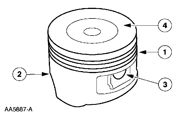 1. Clean and inspect the (1) ring lands, (2) skirts, (3) pin bosses, and the (4) tops of the pistons. If wear marks, scores or glazing is found on the piston skirt, check for a bent or twisted connecting rod.