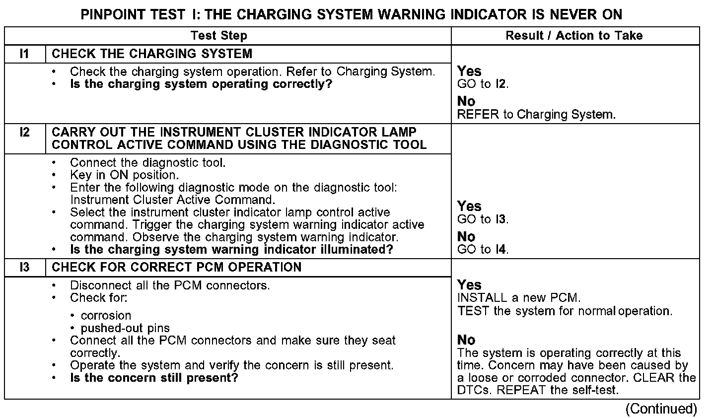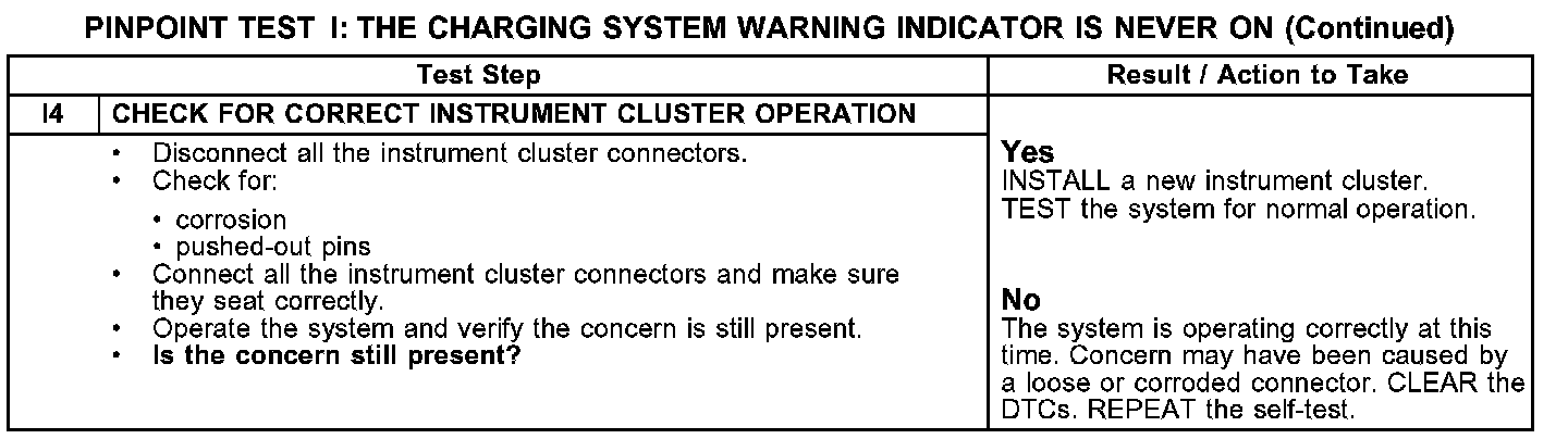 PINPOINT TEST I: THE CHARGING SYSTEM WARNING INDICATOR IS NEVER ON