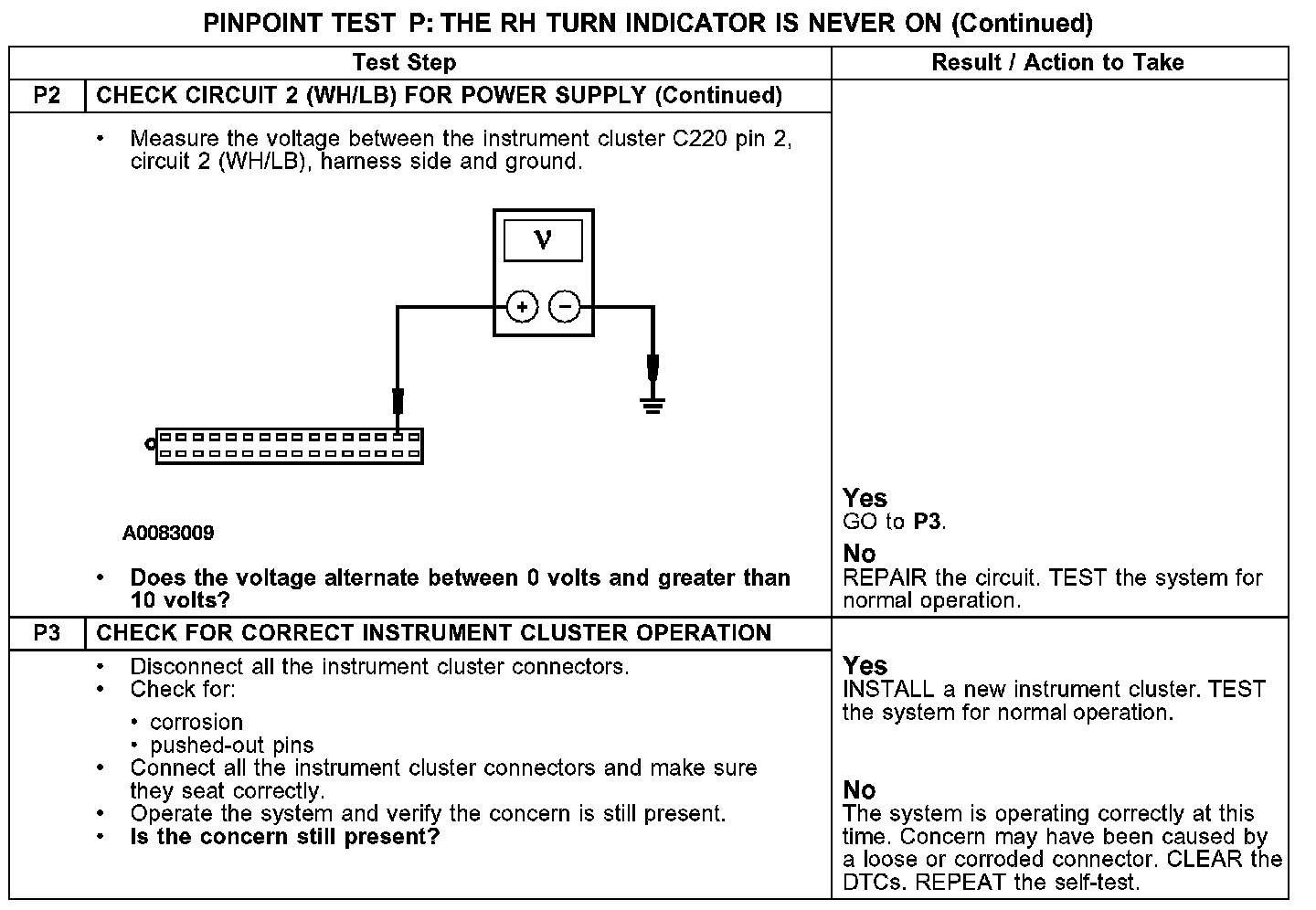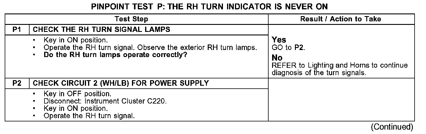 PINPOINT TEST P: THE RH TURN INDICATOR IS NEVER ON