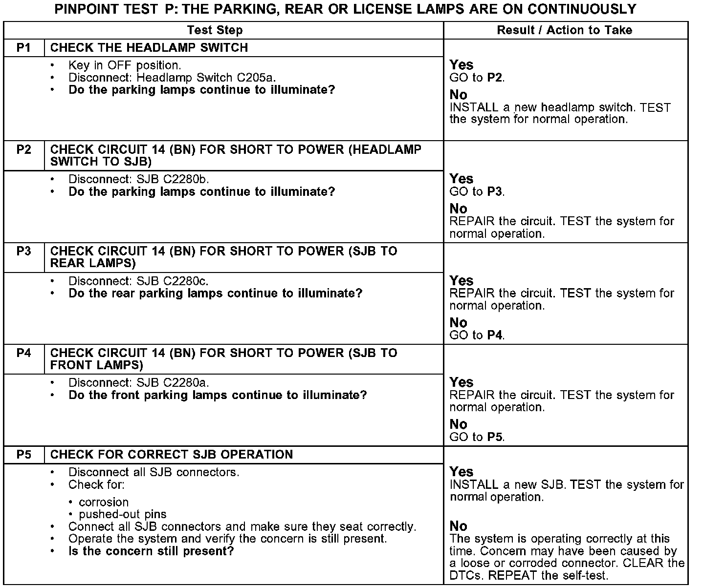 PINPOINT TEST P: THE PARKING, REAR OR LICENSE LAMPS ARE ON CONTINUOUSLY