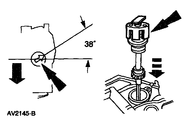 Install the camshaft synchronizer housing assembly so the arrow on the special tool is 38 degrees from the centerline of the engine.