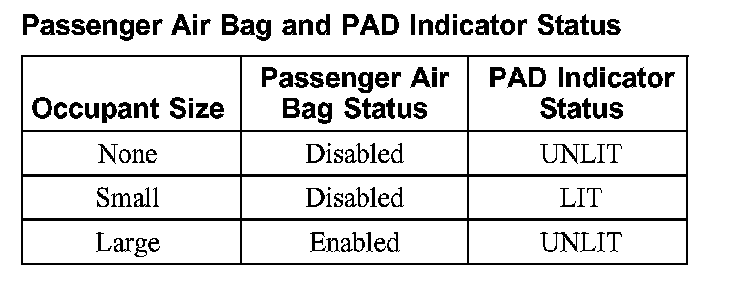 The table indicate the passenger air bag status and the PAD indicator status based the size of the front outboard passenger occupant.