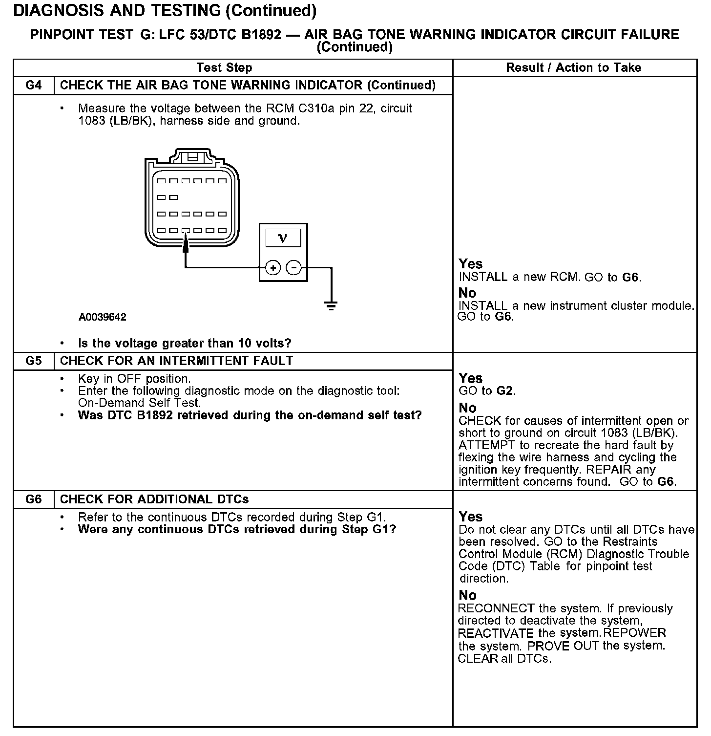 PINPOINT TEST G: LFC 53/DTC B1892 - AIR BAG TONE WARNING INDICATOR CIRCUIT FAILURETest G1-G2: