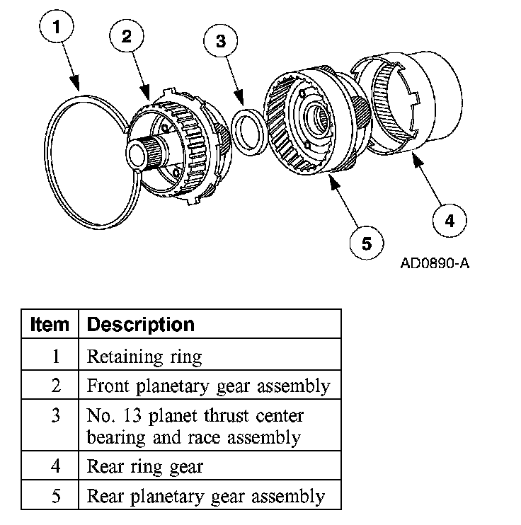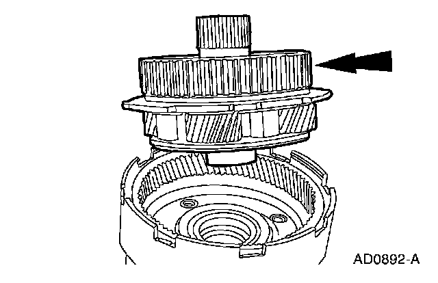 2. Remove the front planet gear assembly. Clean and inspect for looseness and discoloration of the pinion gears or wear on the bearings. Repair as required.
