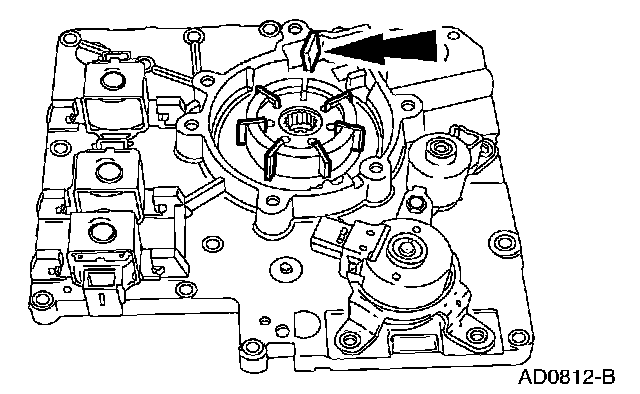 Remove the shift solenoids by pressing locking tab with a screwdriver and rotating them.