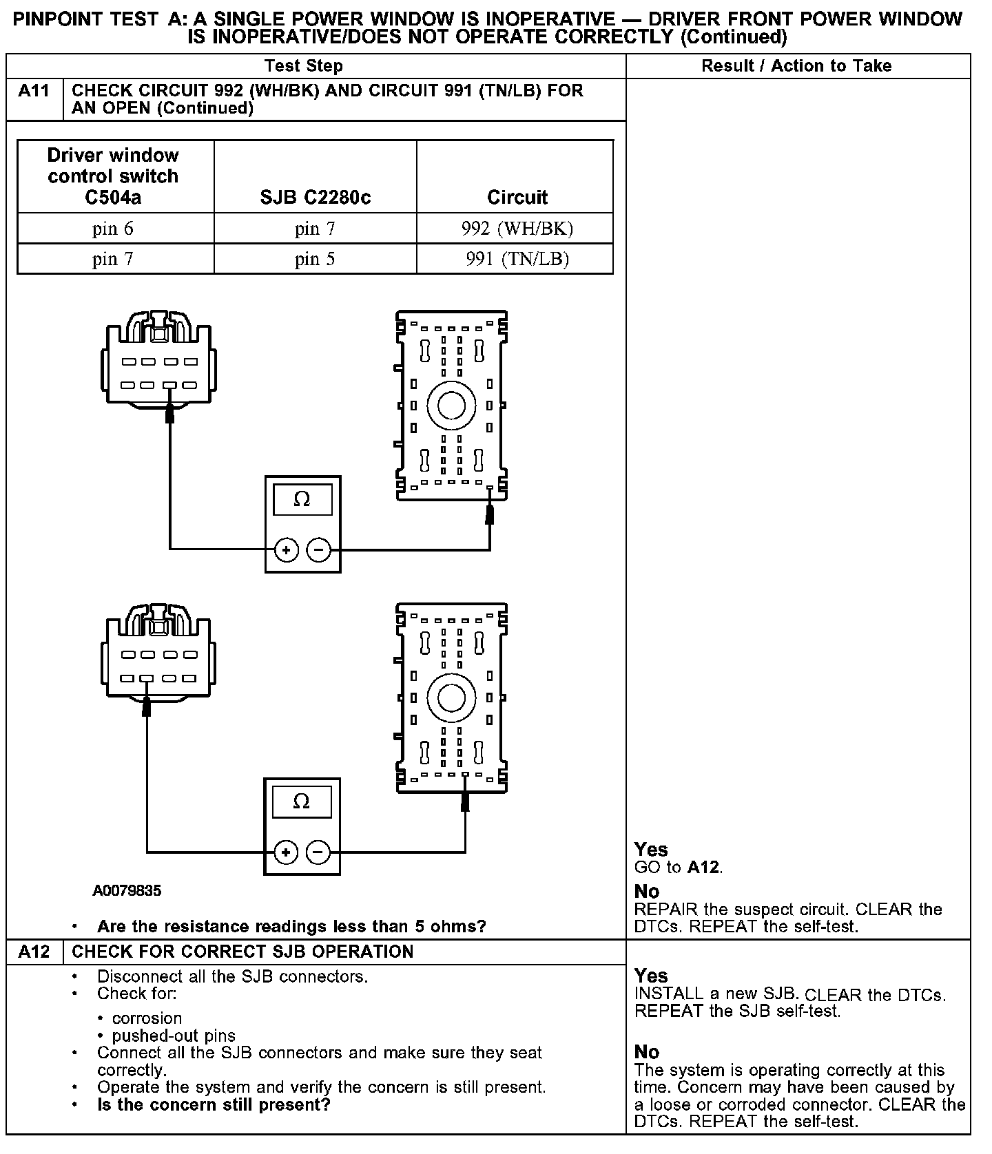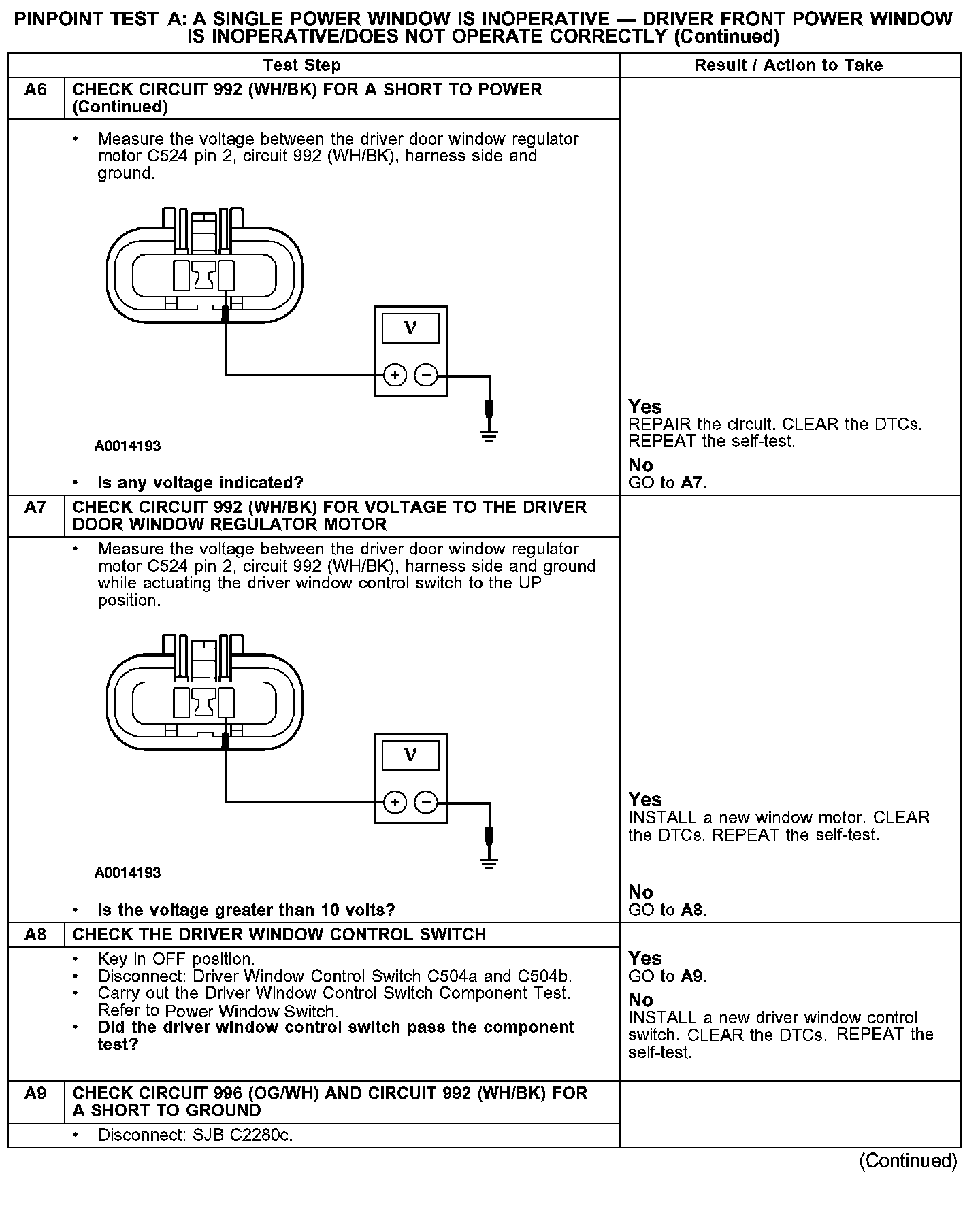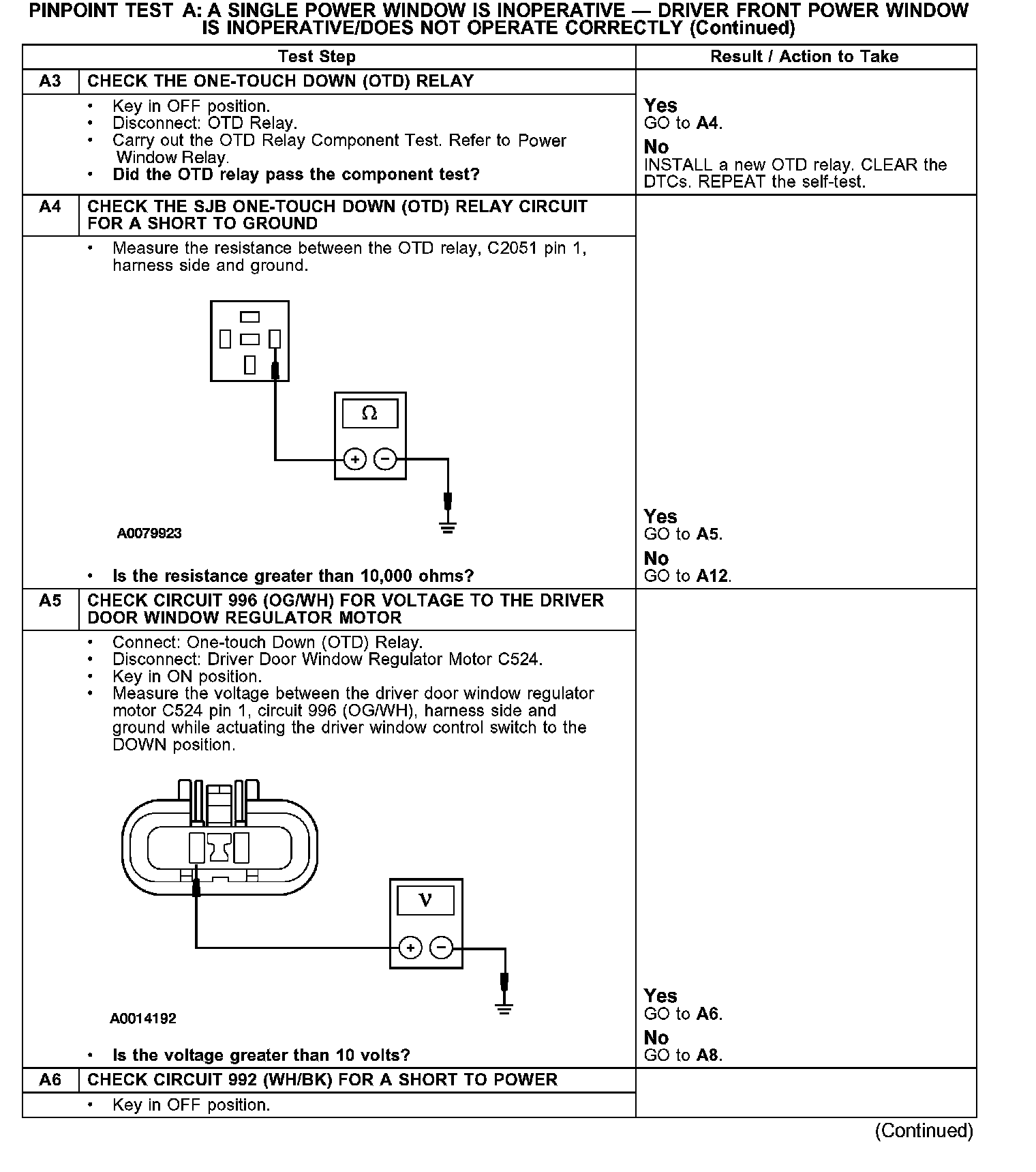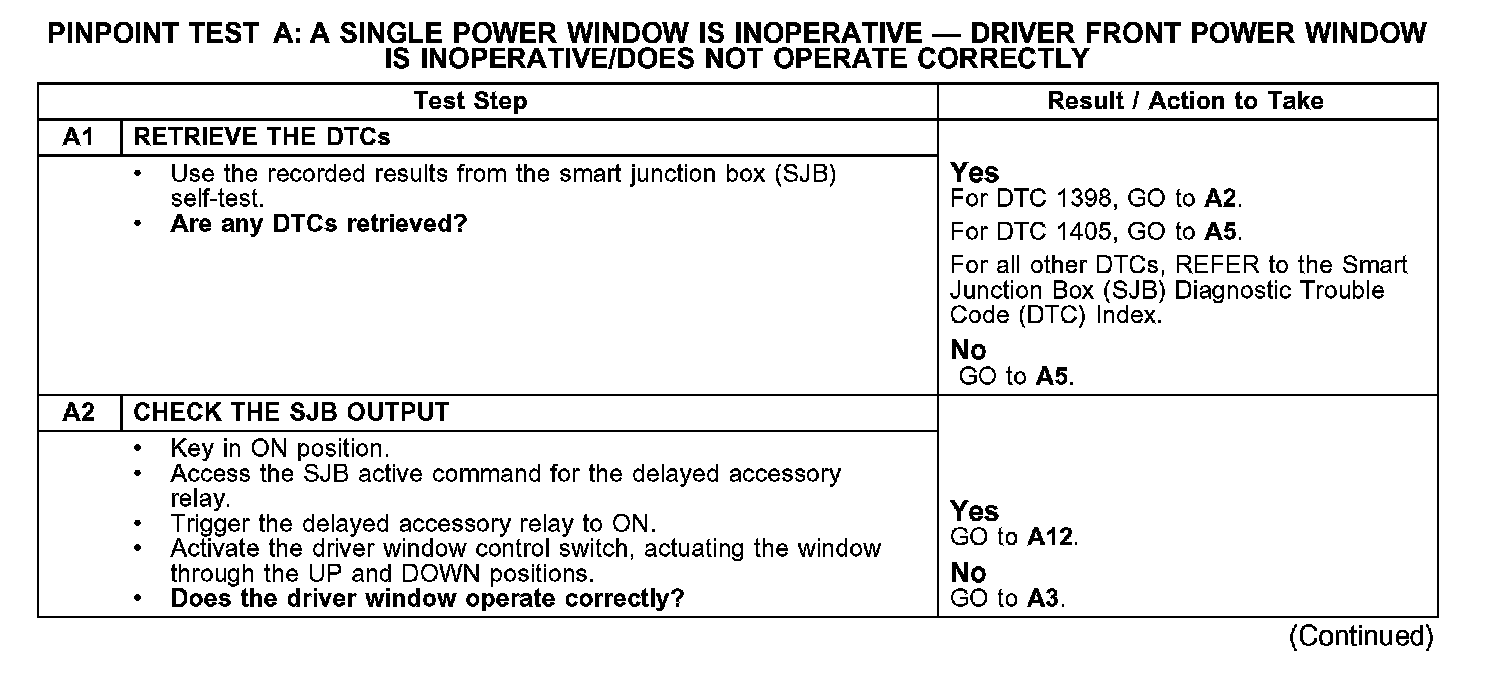PINPOINT TEST A: A SINGLE POWER WINDOW IS INOPERATIVE - DRIVER FRONT POWER WINDOW IS INOPERATIVE/DOES NOT OPERATE CORRECTLY
