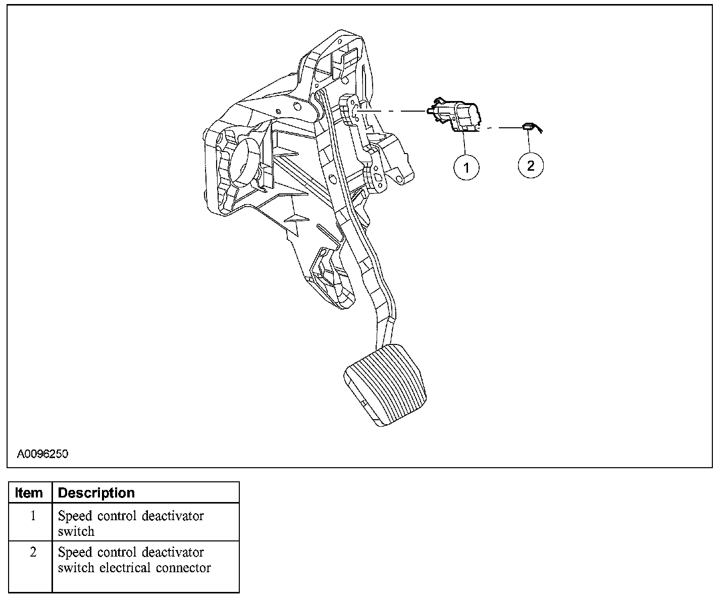 2. CAUTION: Do not press the brake pedal when removing or installing the speed control deactivator switch, as the switch will be damaged.