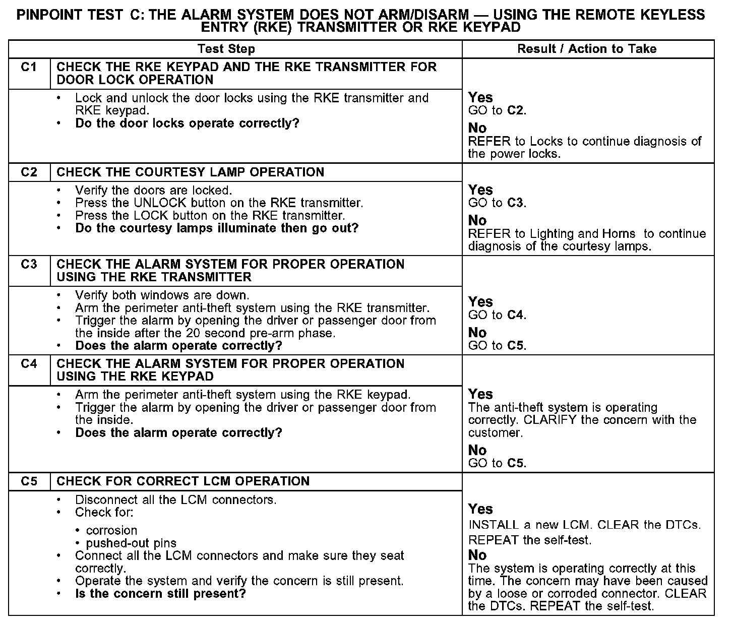 PINPOINT TEST C: THE ALARM SYSTEM DOES NOT ARM/DISARM - USING THE REMOTE KEYLESS ENTRY (RKE) TRANSMITTER OR RKE KEYPADC1-C5: