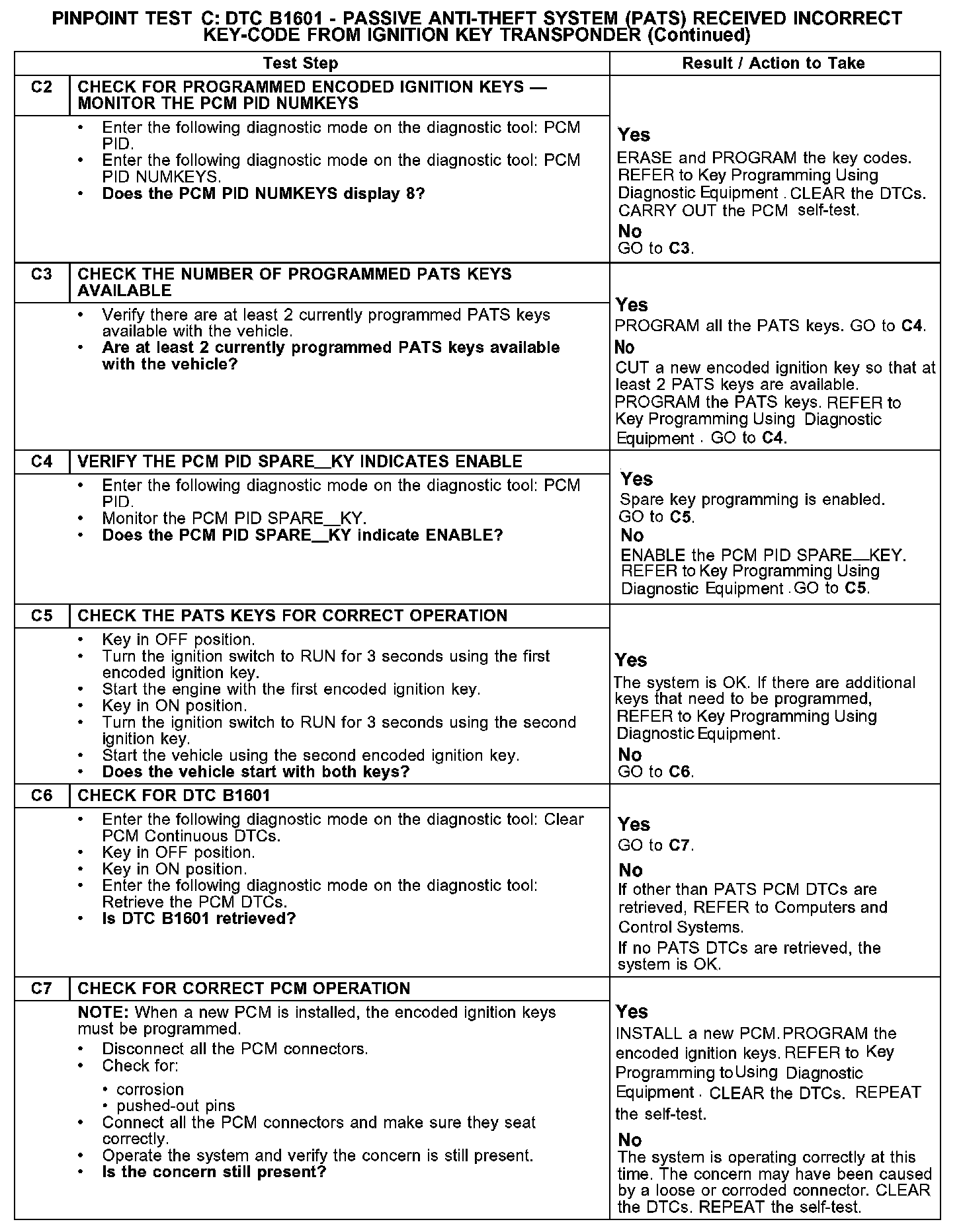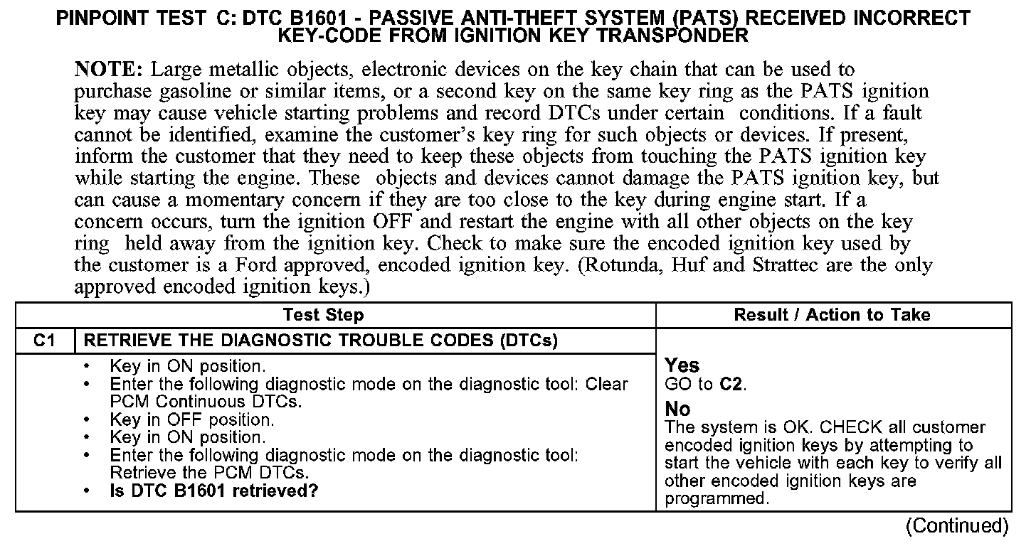 PINPOINT TEST C: DTC B1601 - PASSIVE ANTI-THEFT SYSTEM (PATS) RECEIVED INCORRECT KEY-CODE FROM IGNITION KEY TRANSPONDERC1: