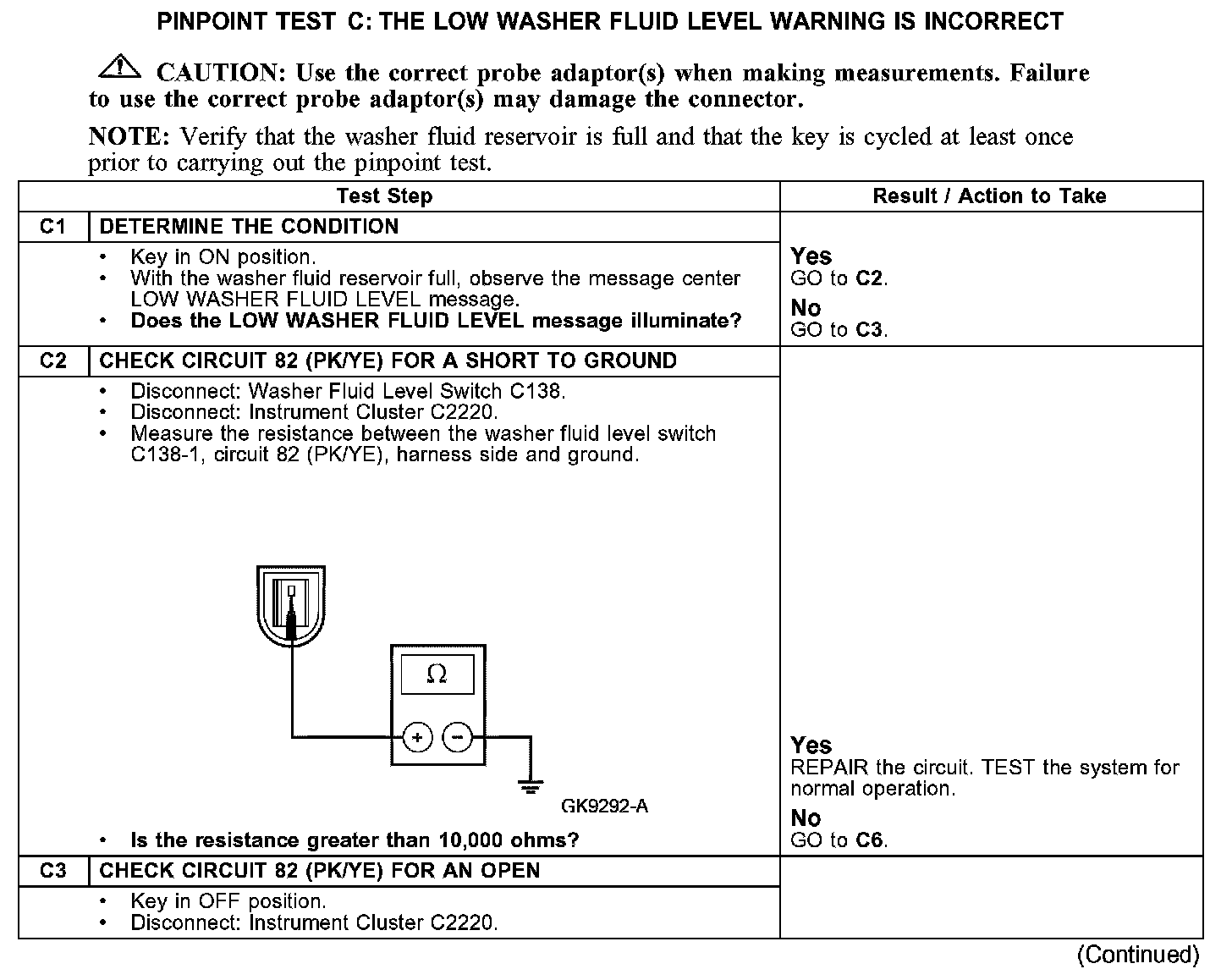 PINPOINT TEST C: THE LOW WASHER FLUID LEVEL WARNING IS INCORRECTC1-C3: