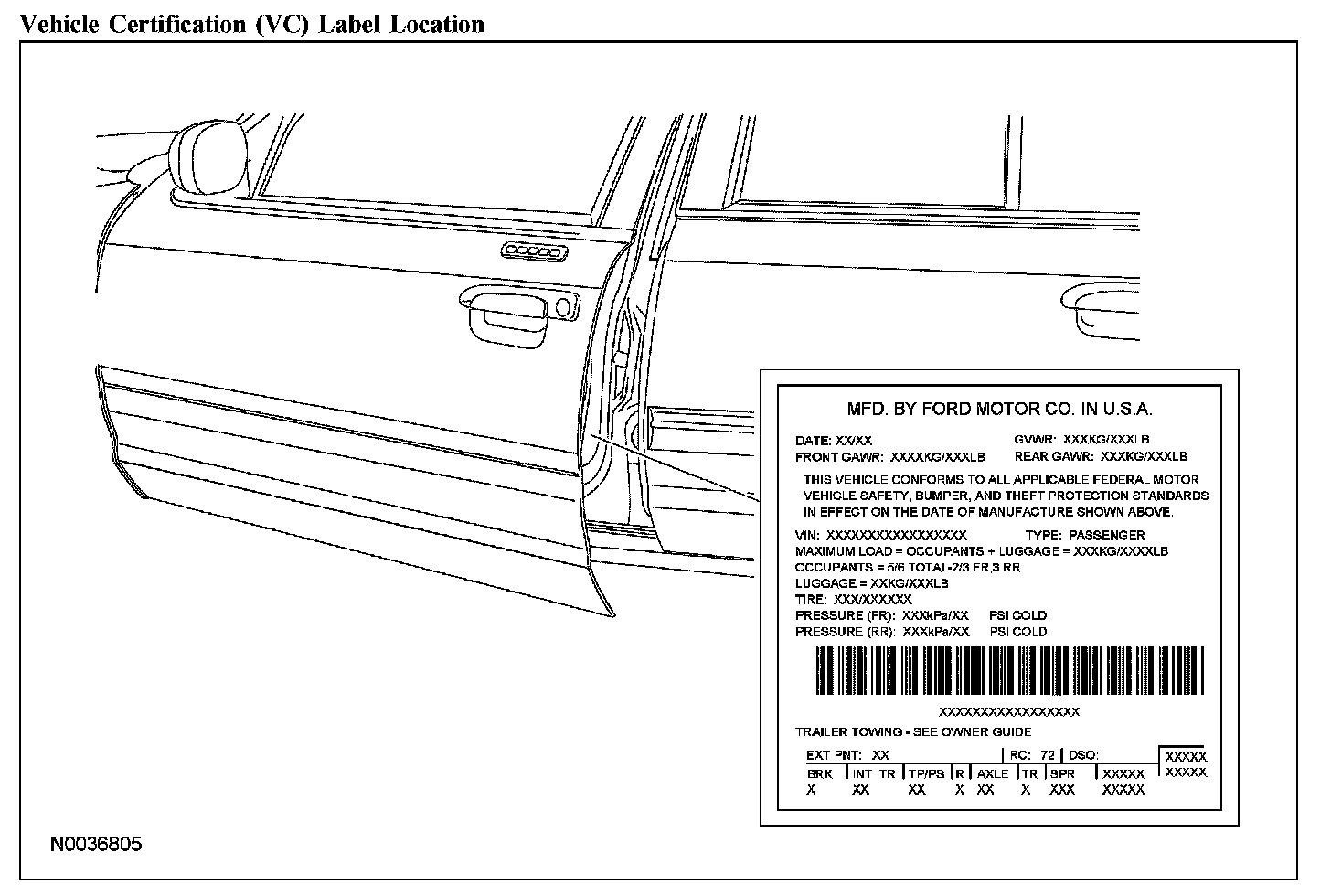 The upper portion of the vehicle certification (VC) label contains the manufacturer name, the month and year of manufacture, the certification statement and the VIN. It also includes gross vehicle weight ratings (GVWR) as well as tire size and pressure ratings. The VC label is located on the left-hand front door edge.