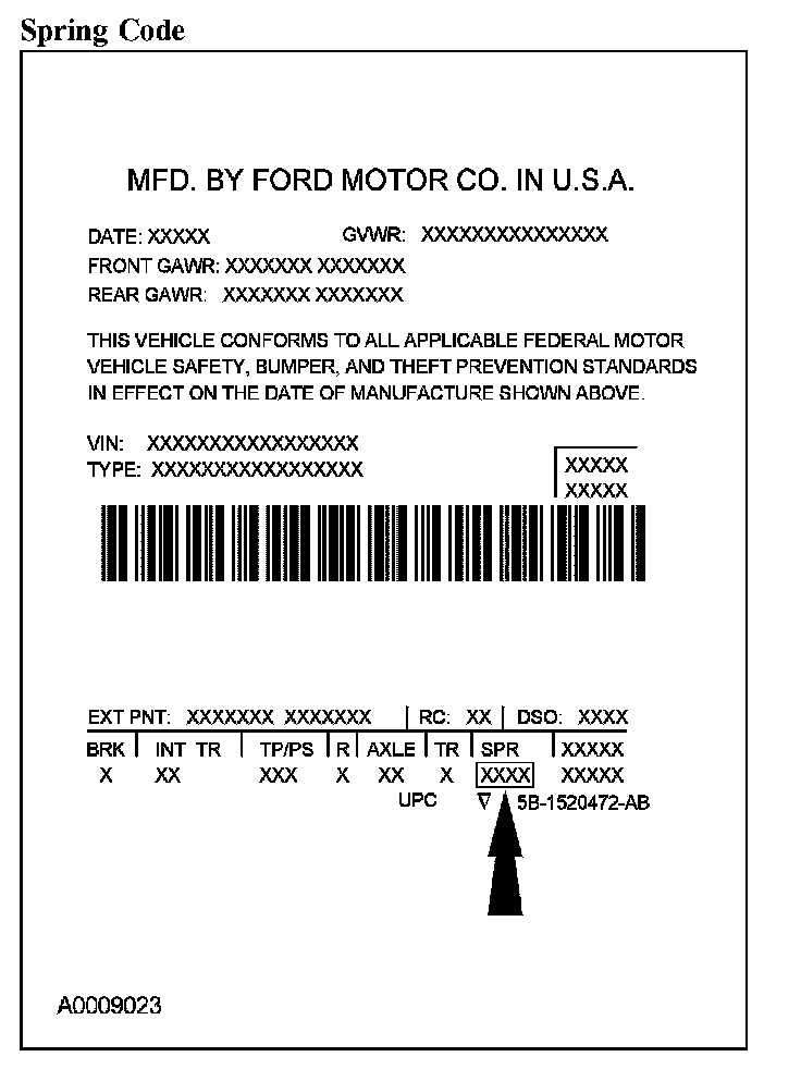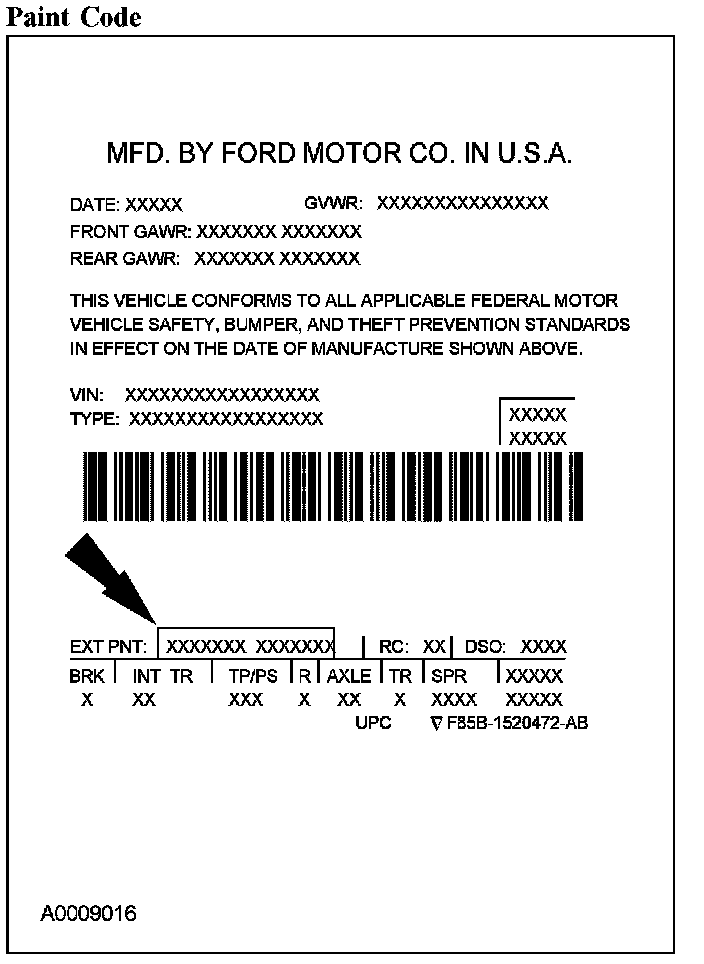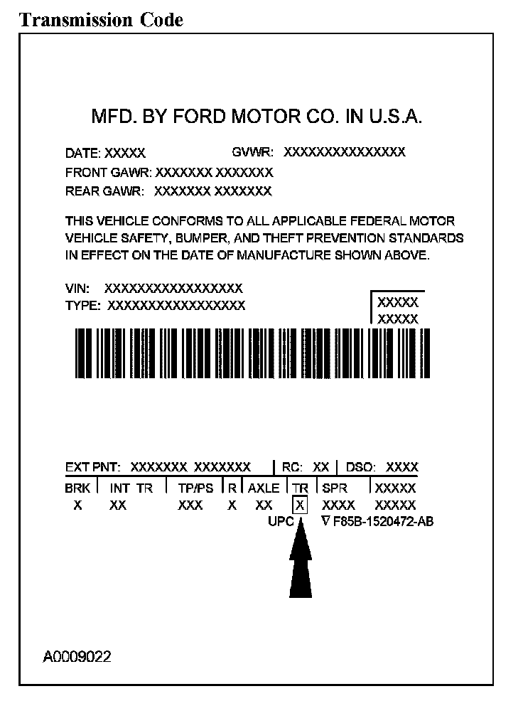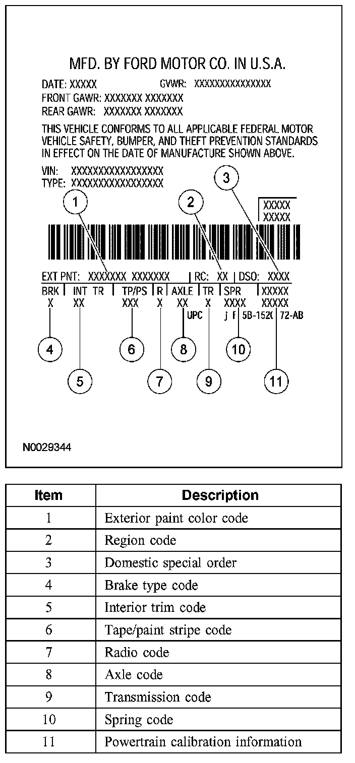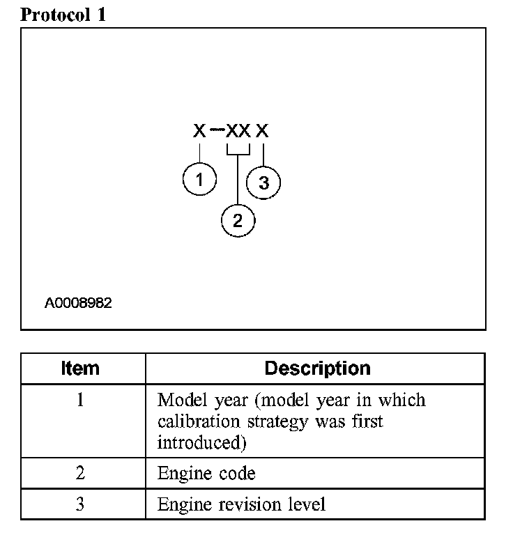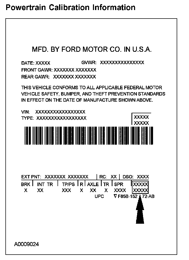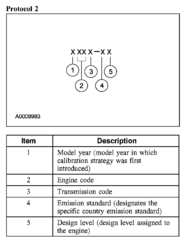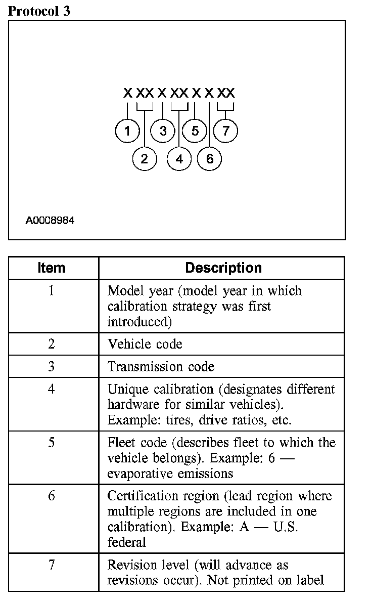 Powertrain calibration information is printed in the lower right corner of the Vehicle Certification Label. Only the base calibration information is printed. Revision levels will not appear, however, they can be found in On Line Automotive Service Information System (OASIS). For the current model year, Ford Motor Company is using 3 different protocols which describe powertrain base calibration. These protocols are designed to provide worldwide standardization for vehicle calibration. If the electronic calibration strategy has been used since 1998 and carried into the current model year, protocol 1 will be used. Refer to Protocol 1. If the electronic calibration strategy has been used since 1999 and is carried into the current model year, protocol 2 will be used. Refer to Protocol 2. For electronic calibration strategies introduced since the 2001 model year, protocol 3 will be used. Refer to Protocol 3.