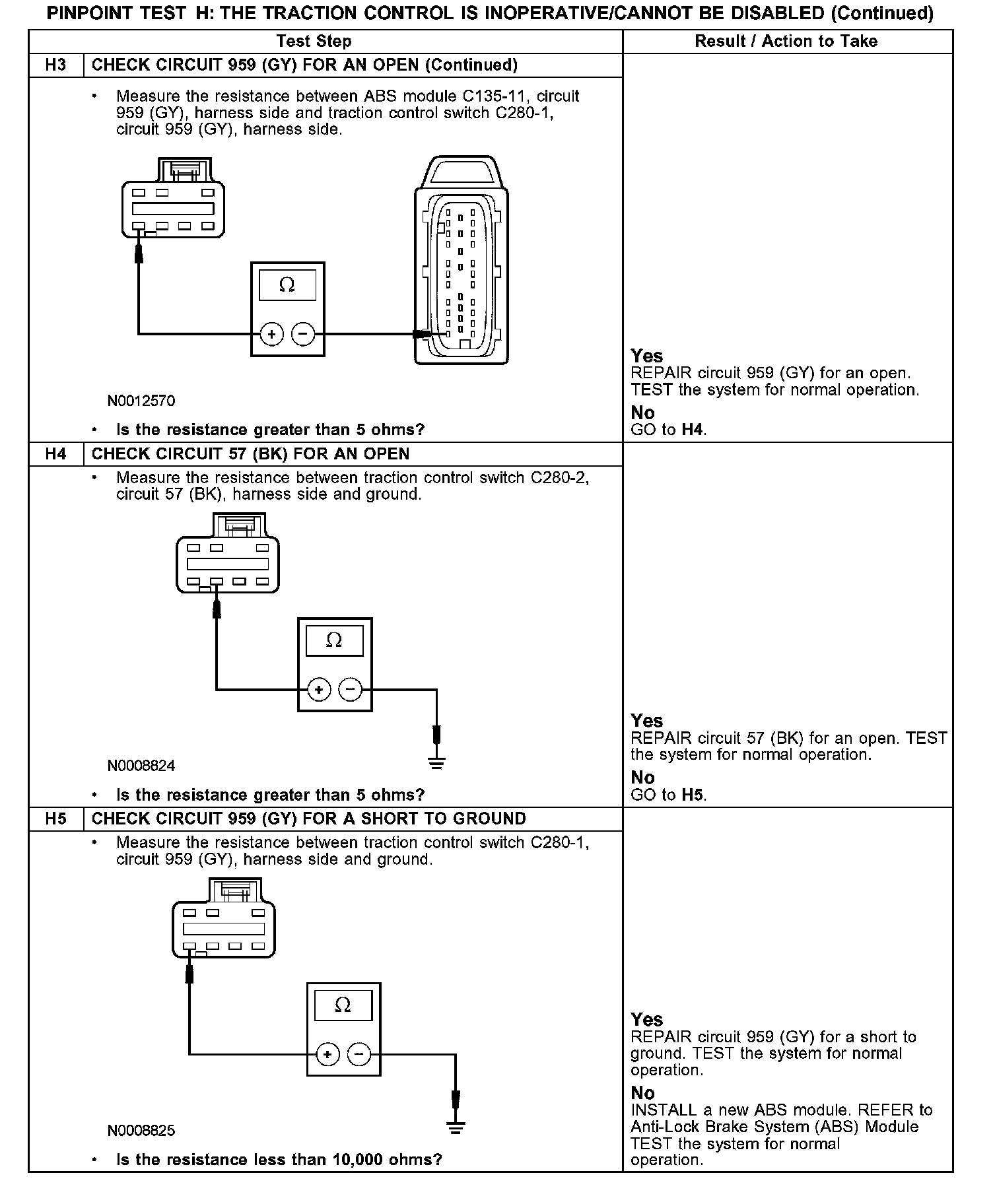 The anti-lock brake system (ABS) module sends a reference voltage to the traction control switch along circuit 959 (GY) to the traction control switch. When the switch is pressed, the reference voltage continues through the switch to ground along circuit 57 (BK). When the ABS module then disables the traction control system when it detects this change in reference voltage.