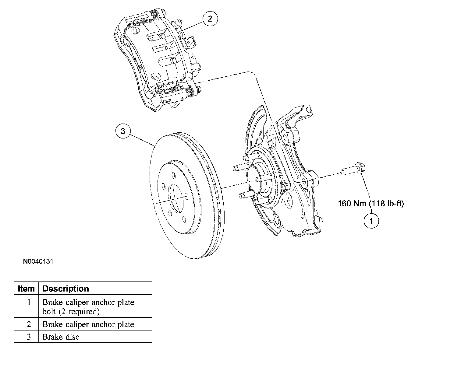 3. CAUTION: Do not allow the brake caliper, brake pads and anchor plate assembly to hang from the brake hose or damage to the hose can occur.
