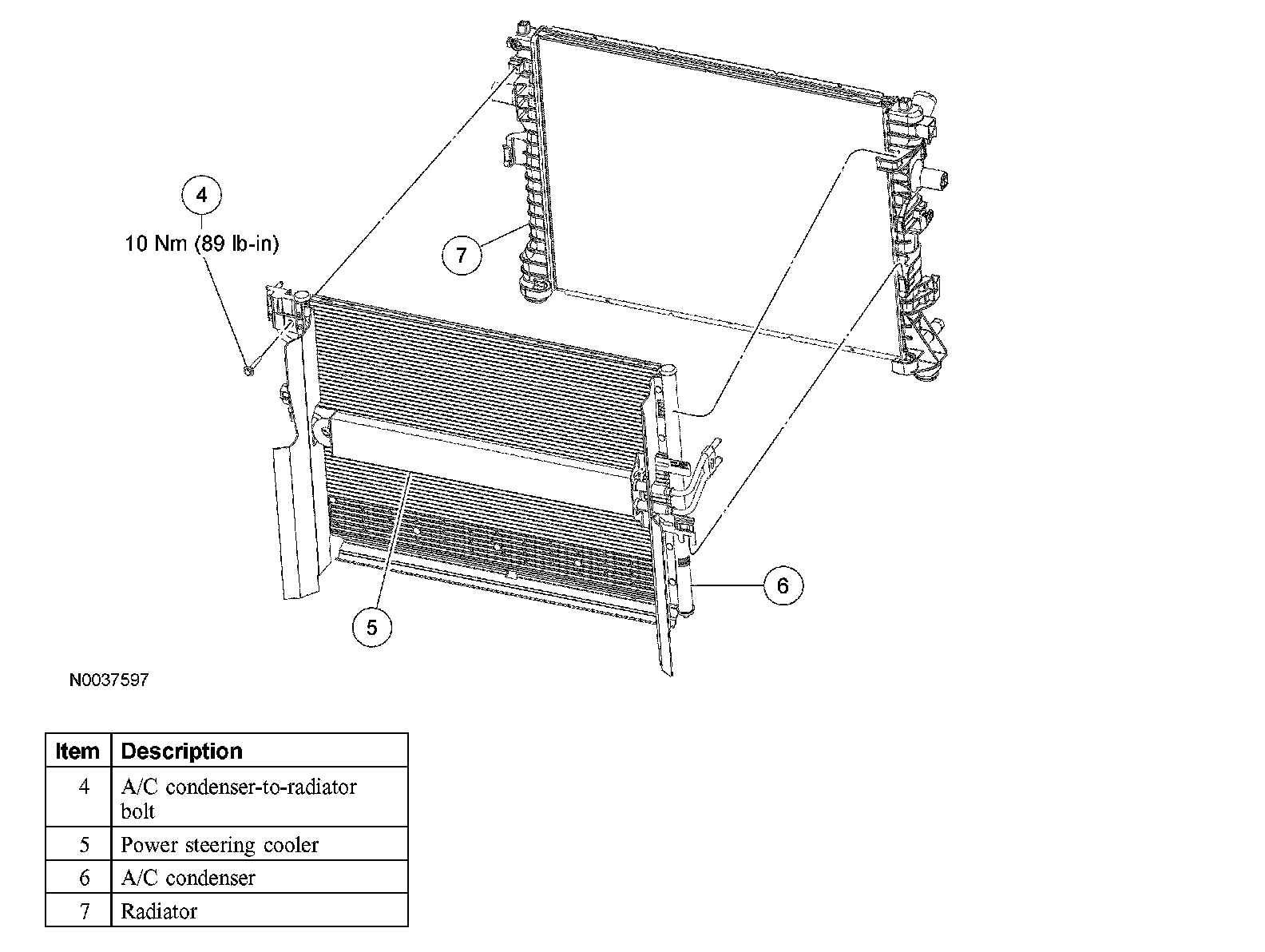 5. Remove the bolt, position the A/C condenser and the power steering cooler away from the radiator, and remove the radiator.