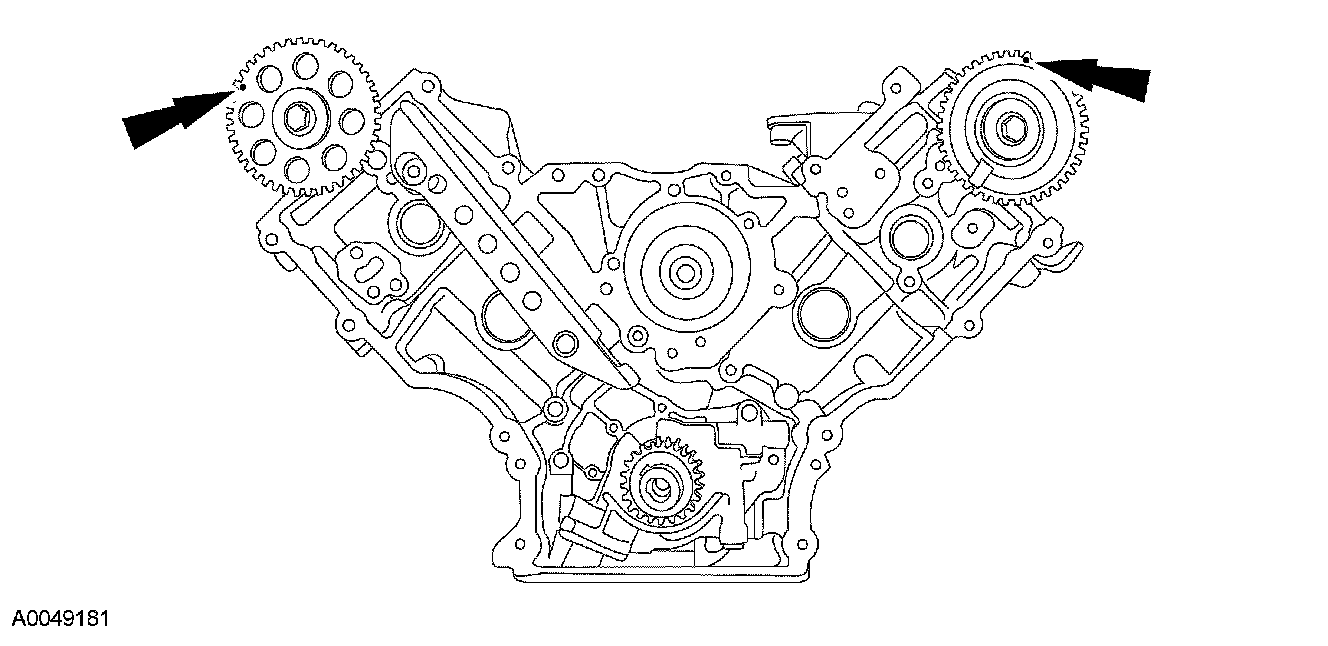 20. Rotate the RH camshaft sprocket until the timing mark is approximately at the 11 o'clock position. Rotate the LH camshaft sprocket until the timing mark is approximately at the 12 o'clock position.
