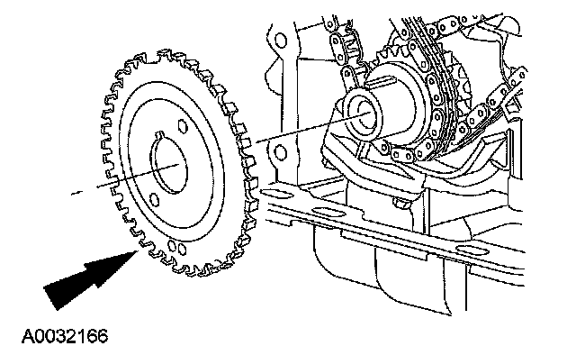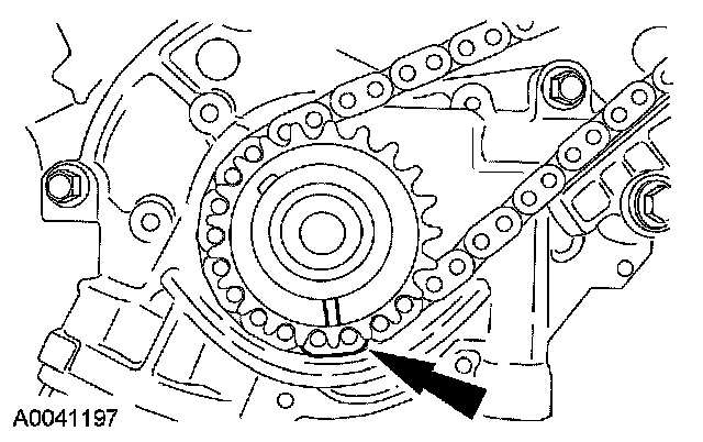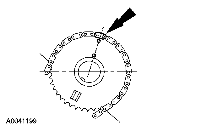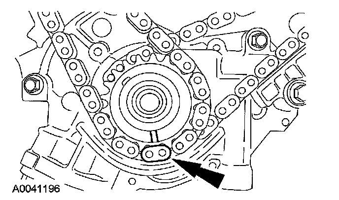 21. Position the LH (inner) timing chain on the crankshaft sprocket, aligning the copper (marked) link with the timing mark on the sprocket.