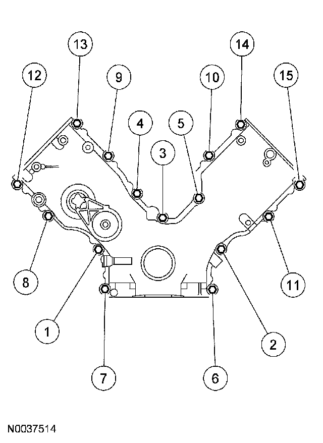 38. Tighten the front cover fasteners in the sequence shown to 25 Nm (18 ft. lbs.).