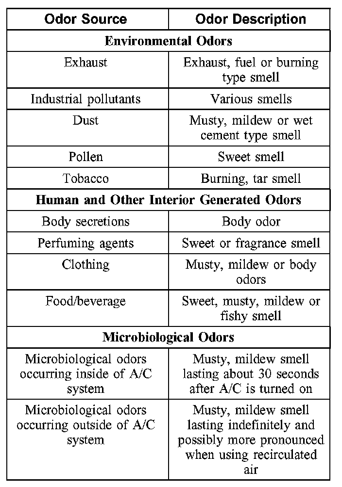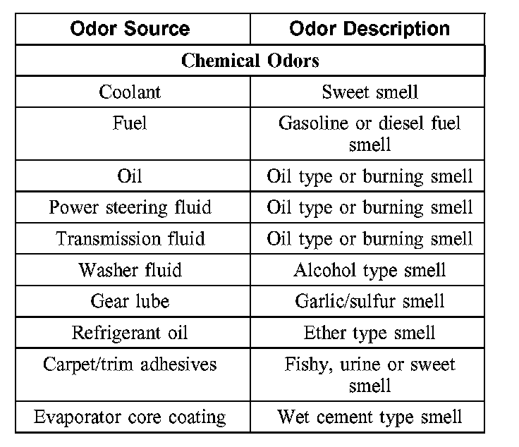 1. Identify the type of odor present in the vehicle. Do not proceed with A/C odor treatment if the odor source is found to be outside of the A/C system. Refer to the chart for examples.