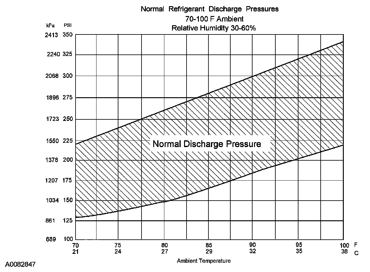 8. Determine if the discharge pressure falls within the normal operating limits using the Normal Refrigerant Discharge Pressures chart.