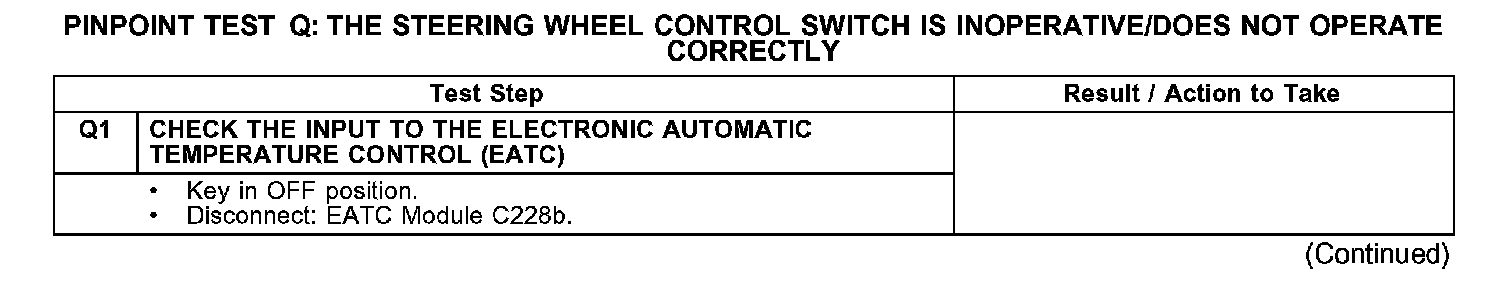 PINPOINT TEST Q: THE STEERING WHEEL CONTROL SWITCH IS INOPERATIVE/DOES NOT OPERATE CORRECTLYQ1: