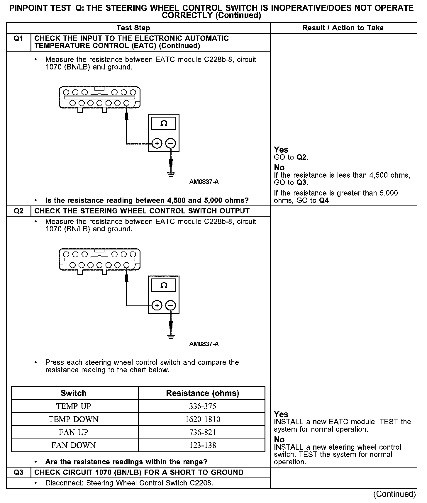 Under normal operation, the electronic automatic temperature control (EATC) module senses the resistance (depending on what button is pressed) from the steering wheel control switch through circuit 1070 (BN/LB). Ground for the steering wheel control switch is provided through circuit 57 (BK).