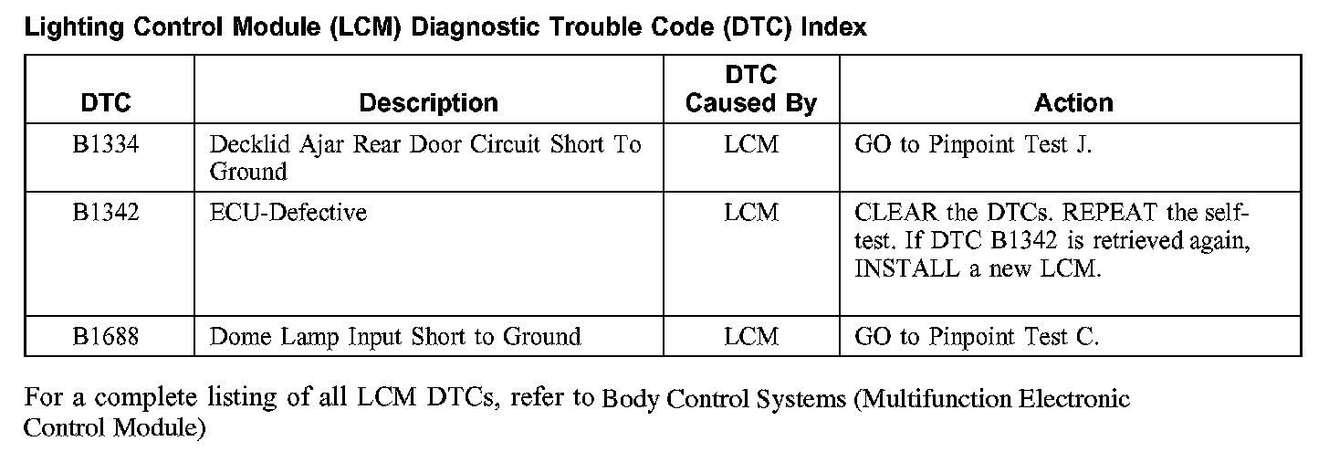 Lighting Control Module (LCM) Diagnostic Trouble Code (DTC) Index
