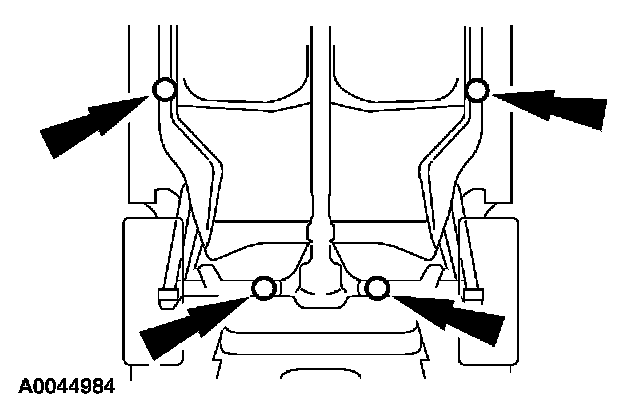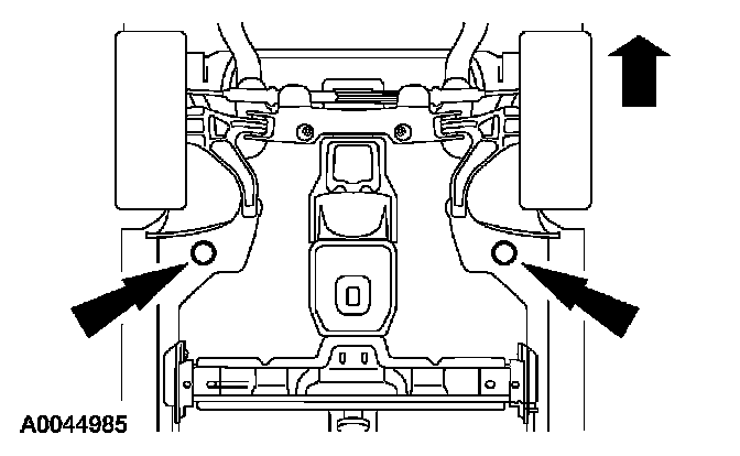 - Do not allow the hoist adapters to contact the steering linkage, suspension arms, stabilizer bar, rear subframe stabilizer brackets or to compress the lower suspension arm stabilizer bar insulator. Damage to the suspension, exhaust and steering linkage components may occur if care is not exercised when positioning the hoist adapters of two-post hoists prior to lifting the vehicle.