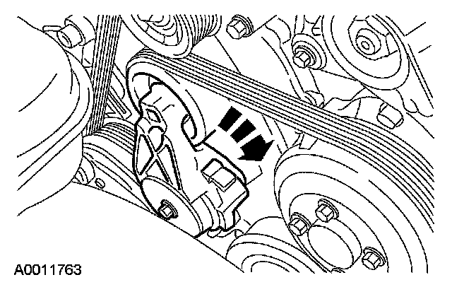 3. Rotate the tensioner and remove the drive belt from the A/C compressor pulley.