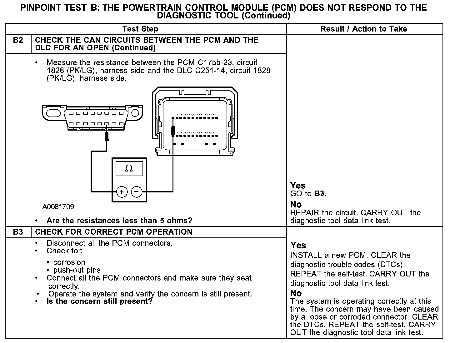 The PCM communicates with the diagnostic tool through the controller area network (CAN), circuits 1827 (WH/LG) and 1828 (PK/LG). Check the CAN circuits between the PCM C175b and the data link connector (DLC) C251. The total resistance values must not be more than 5 ohms. If the resistance is more than 5 ohms, there is either an open in the CAN circuits, damage to the DLC C251, damage to the PCM C175b, or a problem in the in-line connector.
