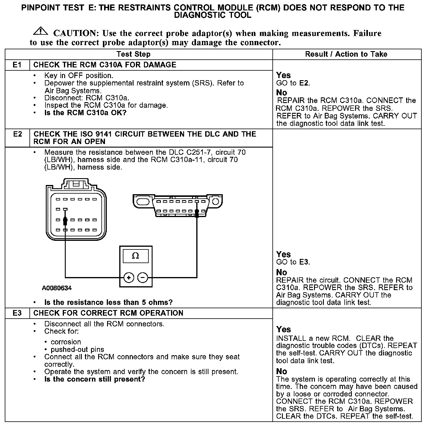 PINPOINT TEST E: THE RESTRAINTS CONTROL MODULE (RCM) DOES NOT RESPOND TO THE DIAGNOSTIC TOOLE1-E3: