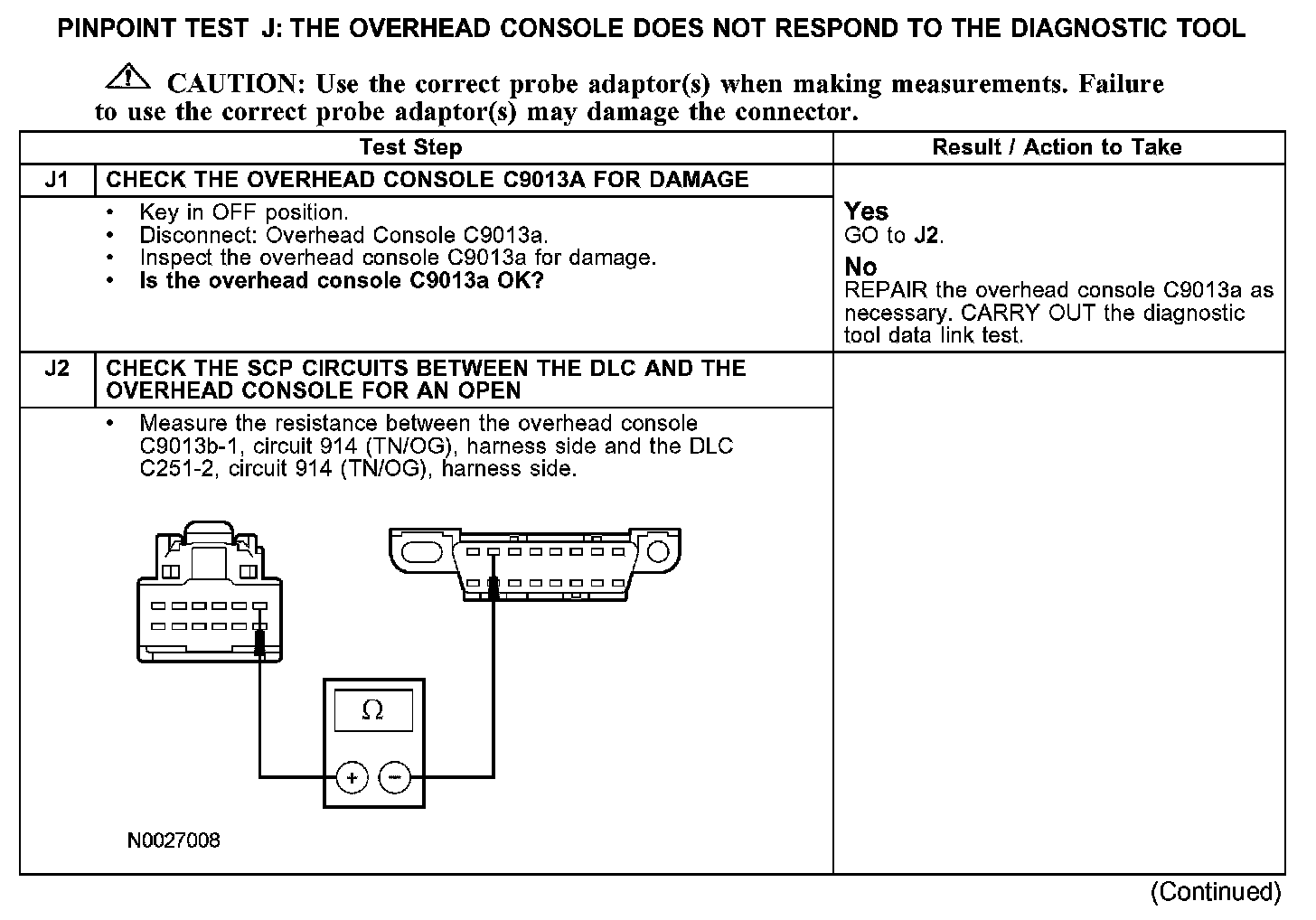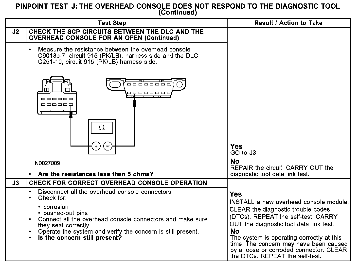The overhead console (if equipped) communicates with the diagnostic tool through the standard corporate protocol (SCP) communications network circuits 914 (TN/OG) and 915 (PK/LB). Check the SCP circuits 914 (TN/OG) and 915 (PK/LB) between the overhead console C9013a and the data link connector (DLC) C251. The total resistance values must not be more than 5 ohms. If the resistance is more than 5 ohms, there is an open in the SCP network circuits, damage to the DLC C251, the overhead console C9013a, or a problem in the in-line connectors.