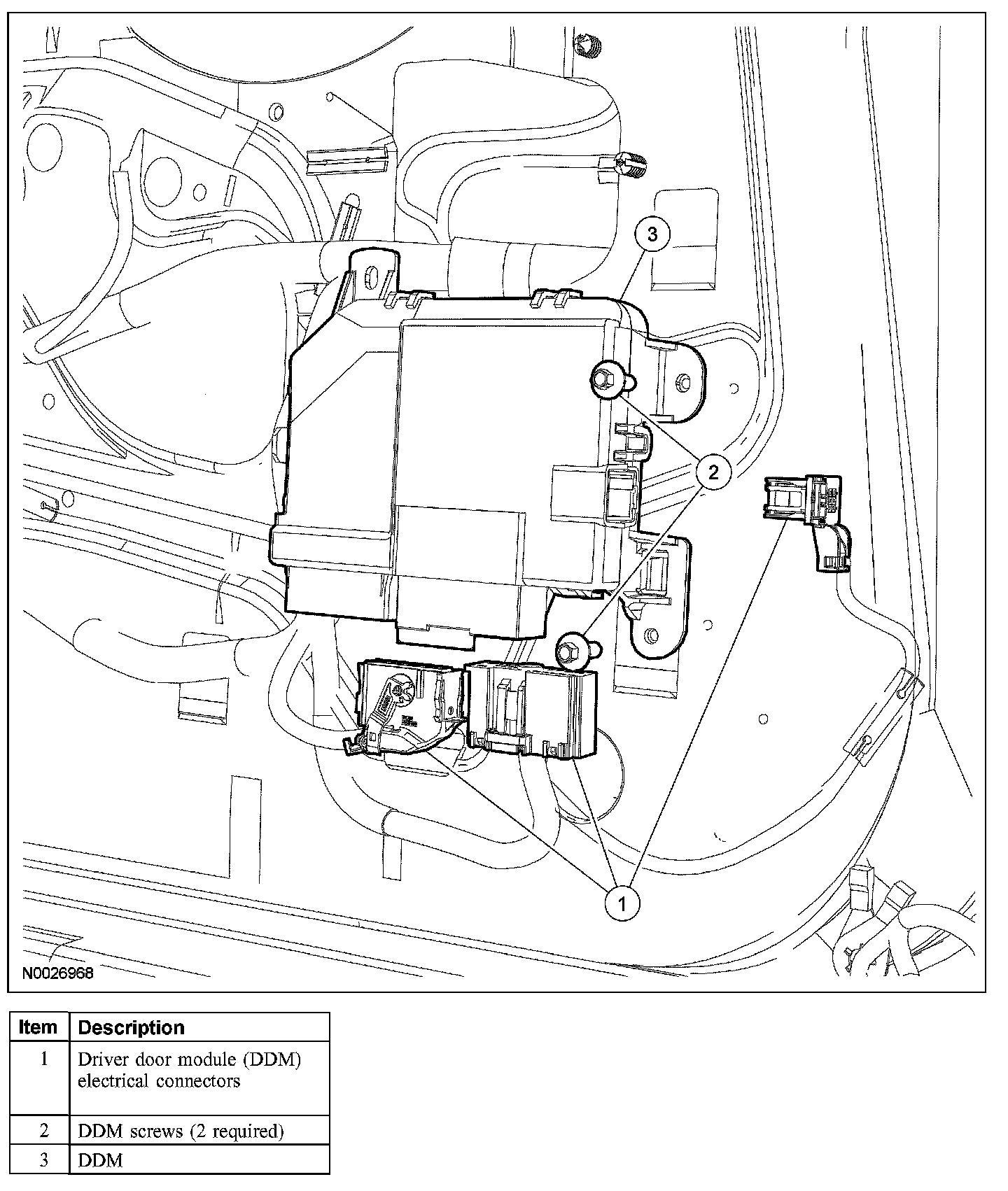 CAUTION: Prior to removal of the driver door module (DDM), it is necessary to upload module configuration information to a diagnostic tool. This information needs to be downloaded into the new module once installed.