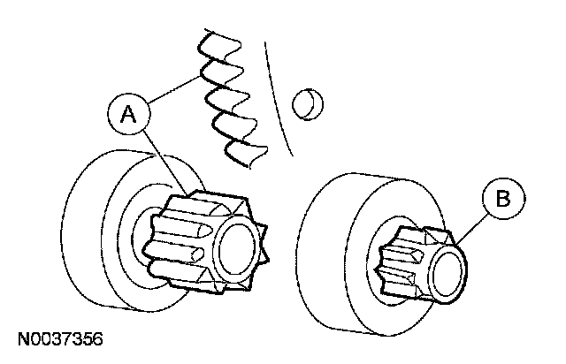 If the (A) starter drive gear and the flywheel ring gear are not fully meshing or the gears are (B) milled or damaged, install a new starter motor. Install a new flywheel ring gear.