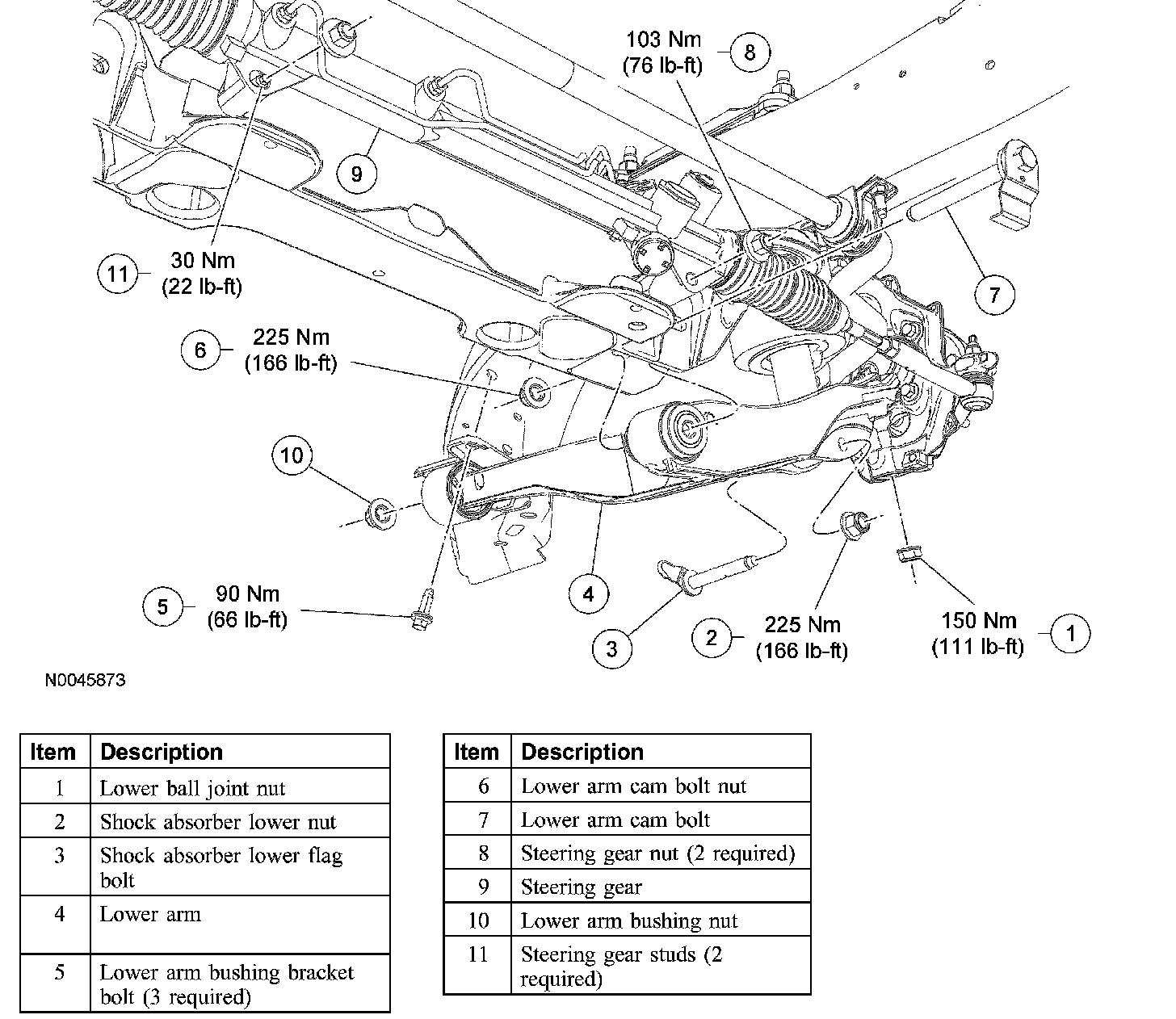 10. NOTE: Snug the lower arm cam nuts and bolts, rear bushing nut and the shock absorber lower nut and flag bolt. Do not tighten until the installation procedure is complete and the weight of the vehicle is resting on the wheel and tire assemblies.