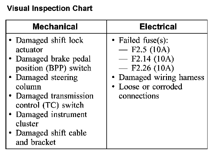 3. If the fault is not visually evident, GO to Symptom Chart - Column Shift or GO to Symptom Chart - Floor Shifter. Diagnosis By Symptom - External Controls