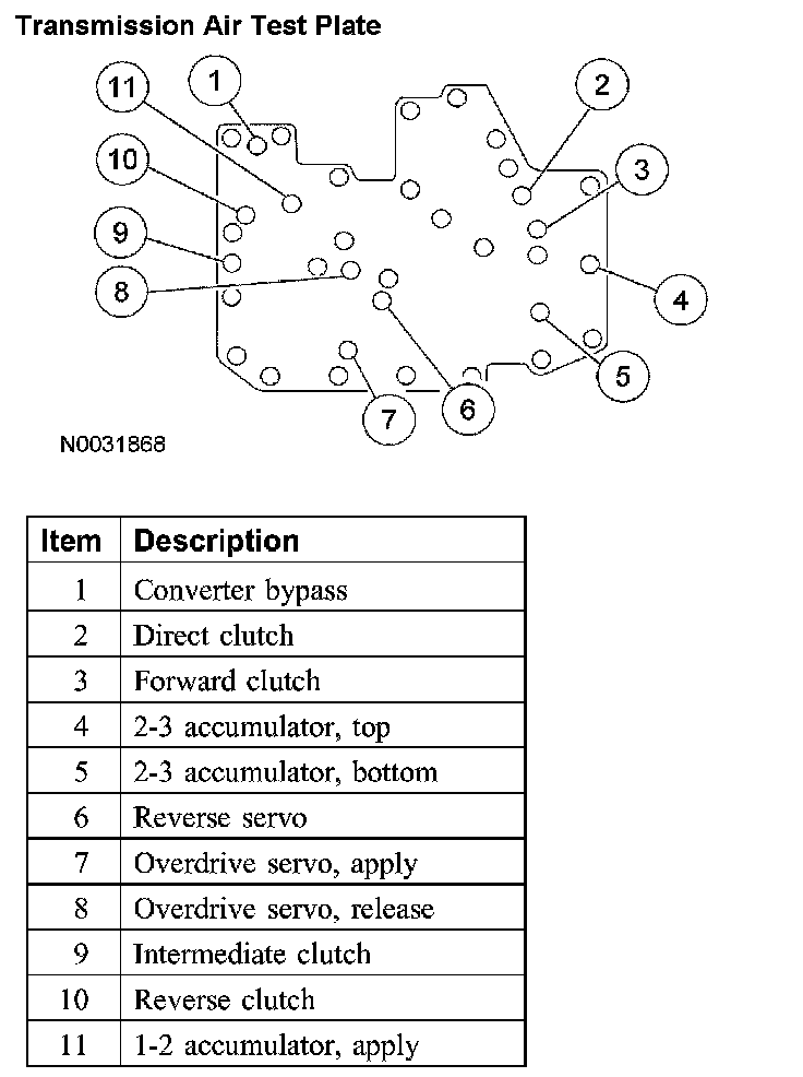 Apply air to the appropriate clutch port (refer to the Transmission Air Test Plate illustration). A dull thud may be heard or movement felt when the component is applied or released. If clutch seals or check balls are leaking a hissing sound may be heard.