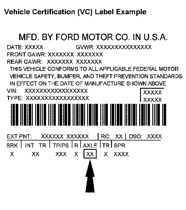 The vehicle certification (VC) label is located in the driver door jamb. The axle code is on the VC label. For information on the VC label, refer to Vehicle/Application and ID.